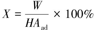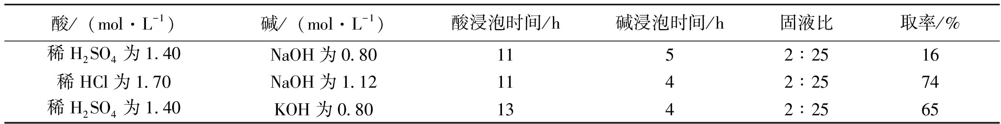 图17 固液比对腐植酸产量的影响 由图17可以看出,当固液比为2∶15时,酸溶液的量太少,无法分离黄腐酸;当固液比为2∶25时,腐植酸产量最高;当固液比为2∶25后,随着浸泡液量的增加,黑腐量开始增加,腐植酸量开始减少。因此,固液比为2∶25较为适宜。 3.5 计算与结果(1)腐植酸百分含量与萃取率见式(3)和式(4): (3) 式中:W——腐植酸百分含量,%; m——提取腐植酸的质量,g; M——风化煤质量,g。 (4) 式中:X——腐植酸萃取率,%。 (2)萃取率计算。在最佳工艺条件下,不同萃取剂在最佳提取条件下对腐植酸萃取率的影响见表2。 表2 不同萃取剂在最佳萃取条件下对腐植酸萃取率的影响