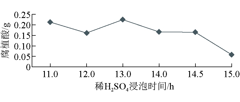 图14 KOH浓度对腐植酸产量的影响 (3)稀H2SO4浸泡时间选择。稀H2SO4浸泡时间对腐植酸产量的影响如图15所示。