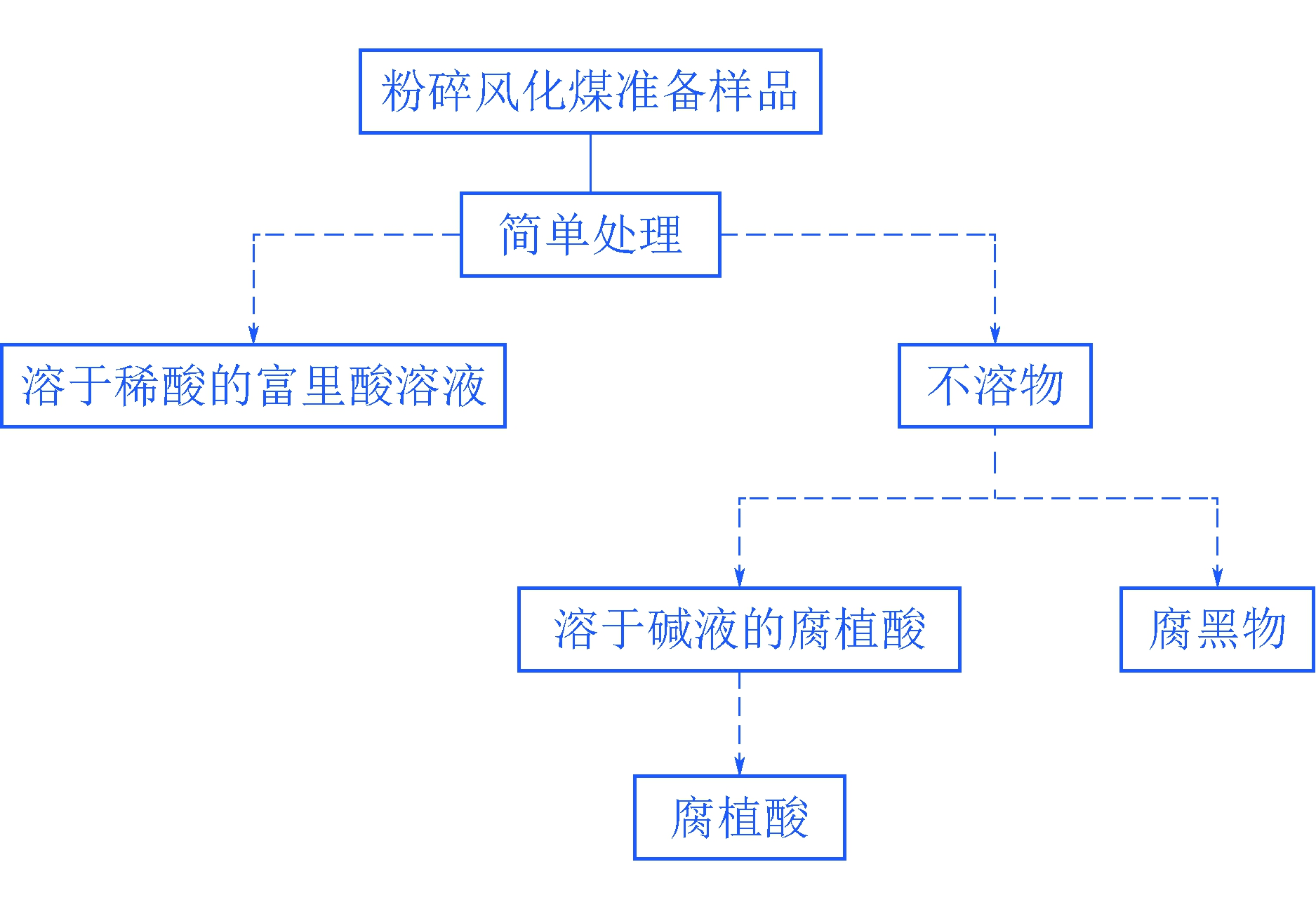 煤样质量/g硫酸亚铁铵标准溶液体积V/mL滴定空白所消耗的标准硫酸亚铁铵溶液的体积V0/mL滴定试液所消耗的标准硫酸亚铁铵溶液的体积V1/mL0.200 322.500 219.800 117.200 20.201 722.500 219.800 517.700 10.202 122.500 219.800 117.200 8 3 风化煤腐植酸的提取工艺研究3.1 试验原理及步骤风化煤中的腐植酸主要有、黄腐酸、黑腐酸和富里酸。根据溶解度的不同,只要在试验中把富里酸与腐黑物分离,就会得到腐植酸。对于含腐植酸的风化煤样,根据溶解度,将其3个组分分离的试验原理及步骤如图2所示。