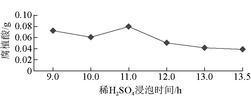 图4 NaOH浓度对腐植酸产量的影响 由图4可以看出,当NaOH浓度为0.6 mol/L时腐植酸产量最低,这是因为NaOH浓度过低不利于腐植酸的溶解,因此当NaOH浓度为0.8 mol/L时,可获得的腐植酸产量较高。 (3)稀H2SO4浸泡时间选择。稀H2SO4浸泡时间对腐植酸产量的影响如图5所示。 由图5可以看出,稀释H2SO4浸泡时间较短不利于黄腐酸的释放,而浸泡时间超过11 h后,又会随着时间的增加导致部分腐植酸被碳化,腐黑物有所增加,因此腐植酸产量减少。由此可得,稀H2SO4的最佳浸泡时间为11 h。