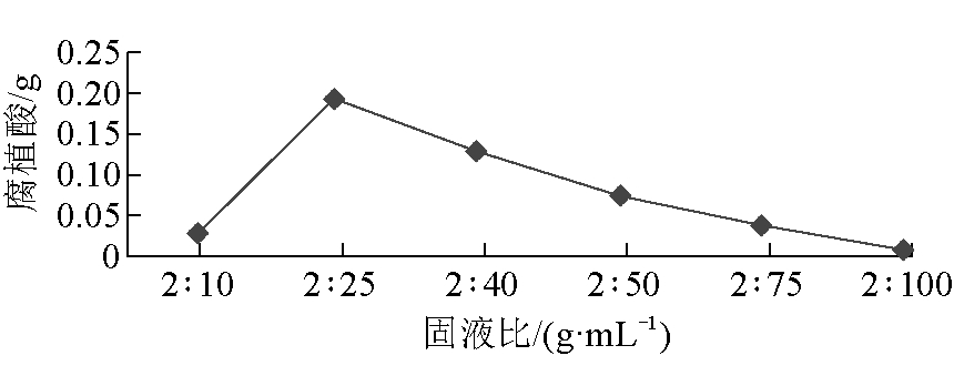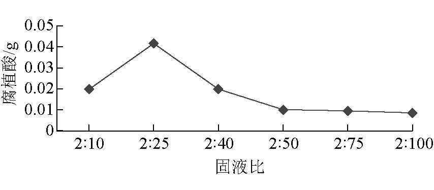 图6 NaOH浸泡时间对腐植酸产量的影响 由图6可以看出,随着浸泡时间的延长,腐植酸的质量整体呈上升趋势,但在4 h和6 h有明显的下降,而在浸泡时间为5 h时可获得的腐植酸产量为0.042 2 g,因此浸泡时间为5 h为最佳。 (5)固液比选择。固液比对腐植酸产量的影响如图7所示。