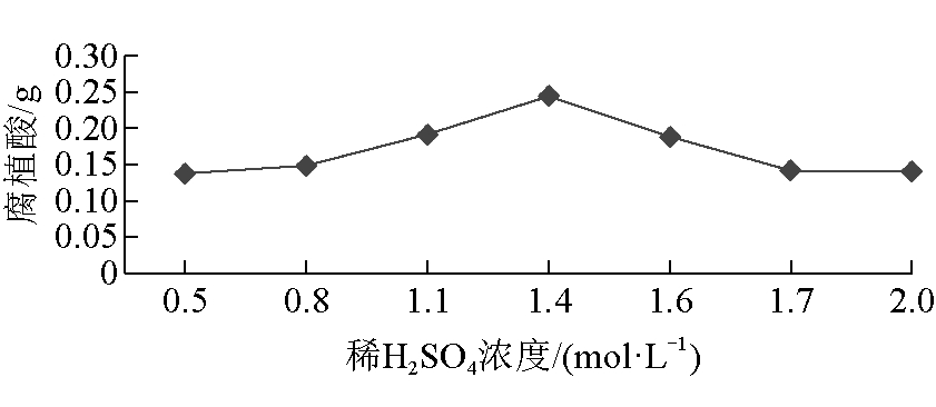 图12 固液比对腐植酸产量的影响 由图12可以看出,随着固液比中溶液体积的增加,腐植酸产量会呈现先增加后减少的趋势。当固液比为2∶25时,获得的腐植酸产量最高,也就是腐植酸萃取率最高;当固液比中溶液体积继续增加,腐植酸的质量开始减少。因此最优固液比为2∶25。 3.4 用稀H2SO4与KOH提取腐植酸(1)稀 H2SO4浓度选择。稀 H2SO4浓度对腐植酸产量的影响如图13所示。