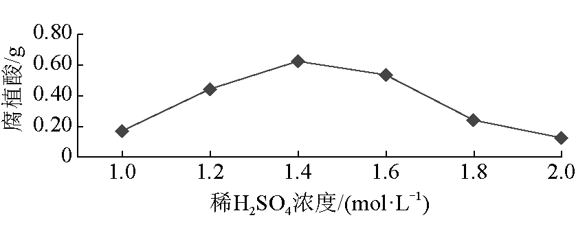 图2 试验原理及步骤 3.2 用稀H2SO4与NaOH提取腐植酸(1)由于H2SO4具有吸水性,因此稀释后的H2SO4浓度不宜过高,否则会导致煤样脱水,因此选取H2SO4浓度小于18.4 mol/L的稀硫酸。稀H2SO4浓度对腐植酸产量的影响如图3所示。 由图3可以看出,稀H2SO4浓度为1.4 mol/L时,腐植酸产量最高。这是因为H2SO4的浓度会影响腐植酸的溶解度,随着H2SO4浓度的增加腐植酸析出会变低,反而会影响到腐植酸的提取效果。