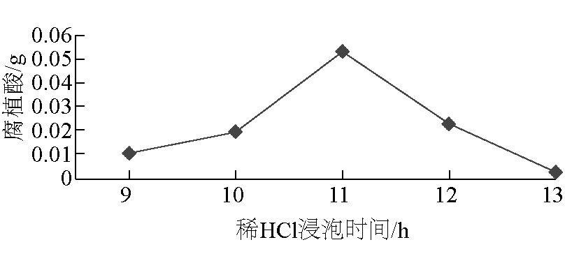 图9 NaOH浓度对腐植酸产量的影响 由图9可以看出,当NaOH浓度为0.6 mol/L时腐植酸的产量较低,此时风化煤中的腐植酸并没有完全分离;但当浓度超过1.12 mol/L时,则超过了溶出腐植酸的最适宜范围,因此浓度在1.10~1.12 mol/L之间为最佳浓度。 (3)稀HCl浸泡时间选择。稀HCl浸泡时间对腐植酸产量的影响如图10所示。