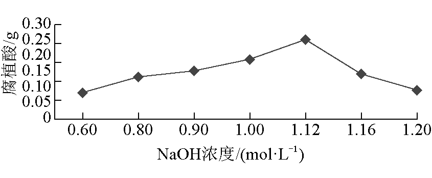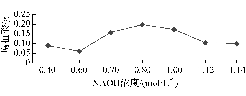 图3 稀H2SO4浓度对腐植酸产量的影响 (2)NaOH浓度的选择。由于腐殖质由腐植酸、黄腐酸和黑腐酸组成,而腐植酸易溶于碱性溶液中,因此选用NaOH能够达到分离腐植酸的目的。NaOH浓度对腐植酸产量影响如图4所示。