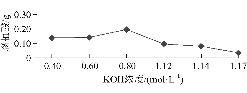 图13 稀 H2SO4浓度对腐植酸产量的影响 由图13可以看出,稀释H2SO4浓度为1.4 mol/L时,腐植酸产量最高,不溶物(黑腐酸)数量最少。 (2)KOH浓度选择。KOH浓度对腐植酸产量的影响如图14所示 。 由图14可以看出,当KOH浓度为0.4 mol/L时,风化煤中的腐植酸不能完全分离,而KOH浓度过高则会影响腐植酸的质量;当KOH浓度为0.8 mol/L时,腐植酸产量最高,为0.195 8 g。