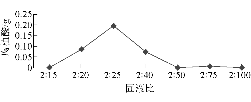 图16 KOH浸泡时间对腐植酸产量的影响 由图16可以看出,当碱性溶液浸泡1 h时,腐植酸产量很小,这表明时间太短不利于腐植酸的分离,并最终影响腐植酸产量;在KOH溶液浸泡4 h,腐植酸的产量最高。 (5)固液比选择。固液比对腐植酸产量的影响如图17所示。