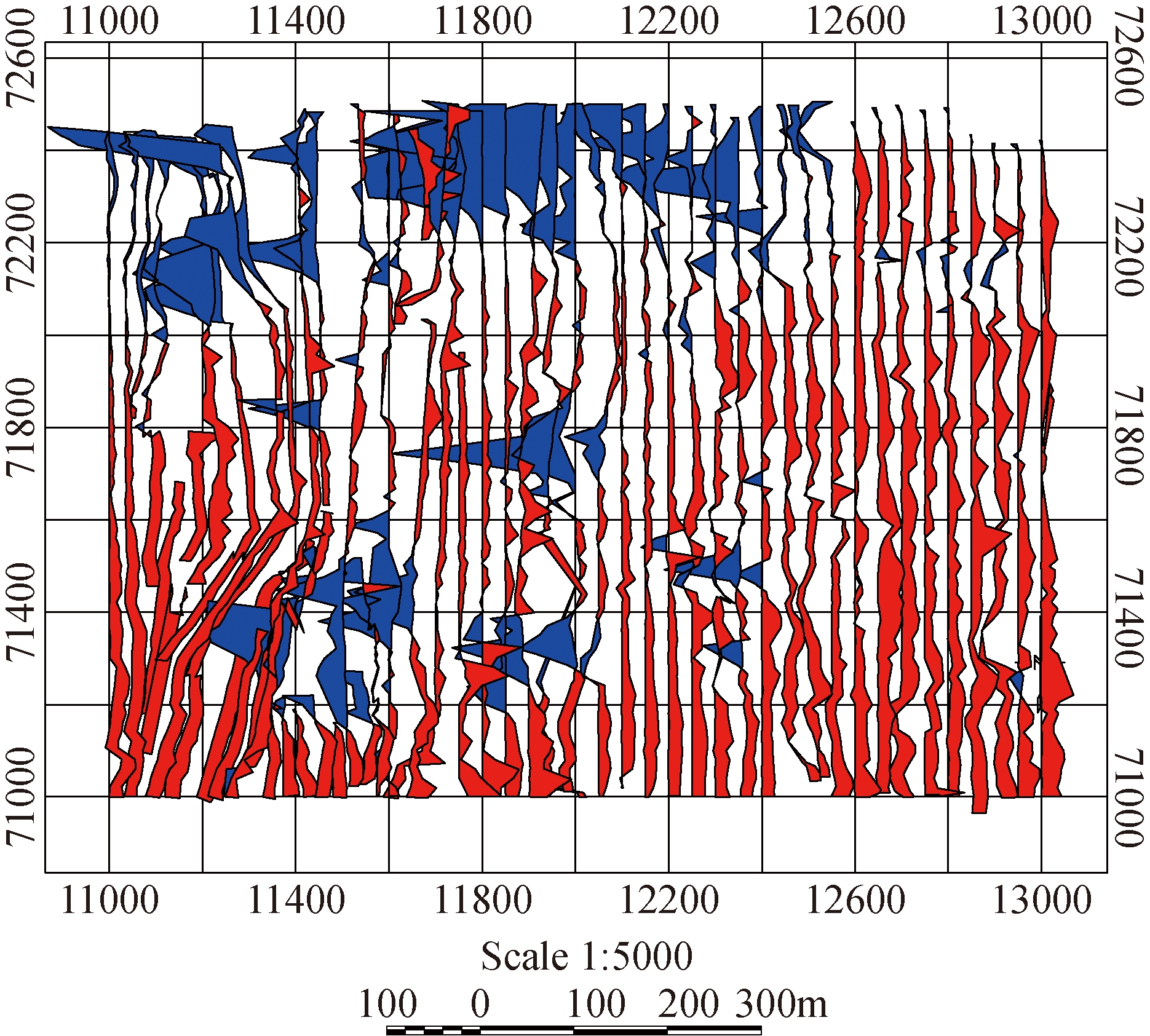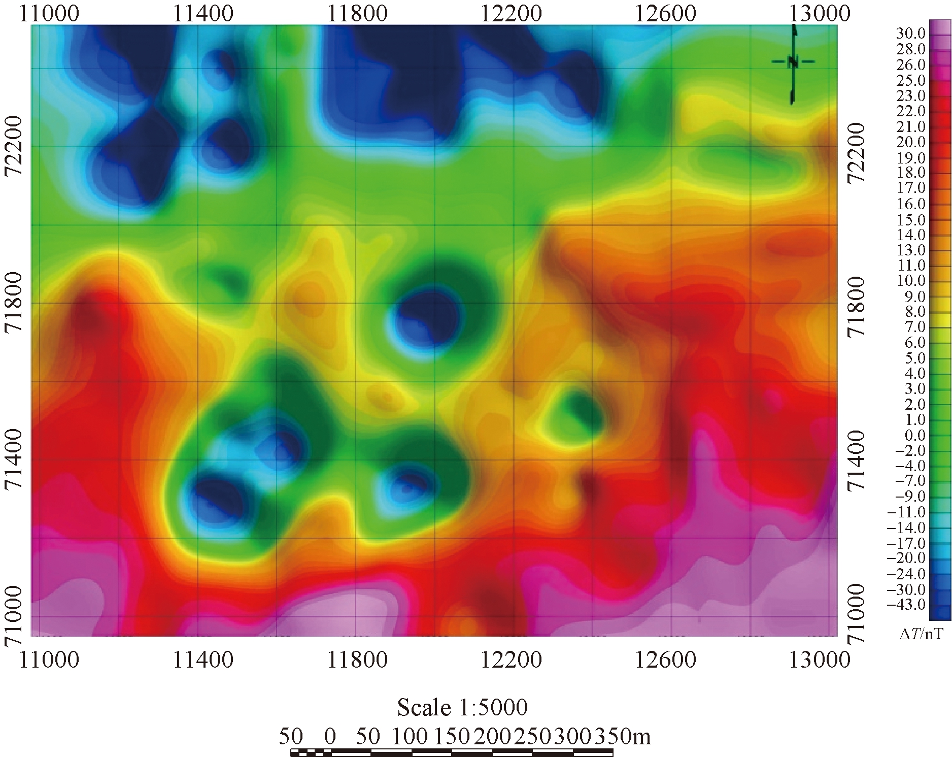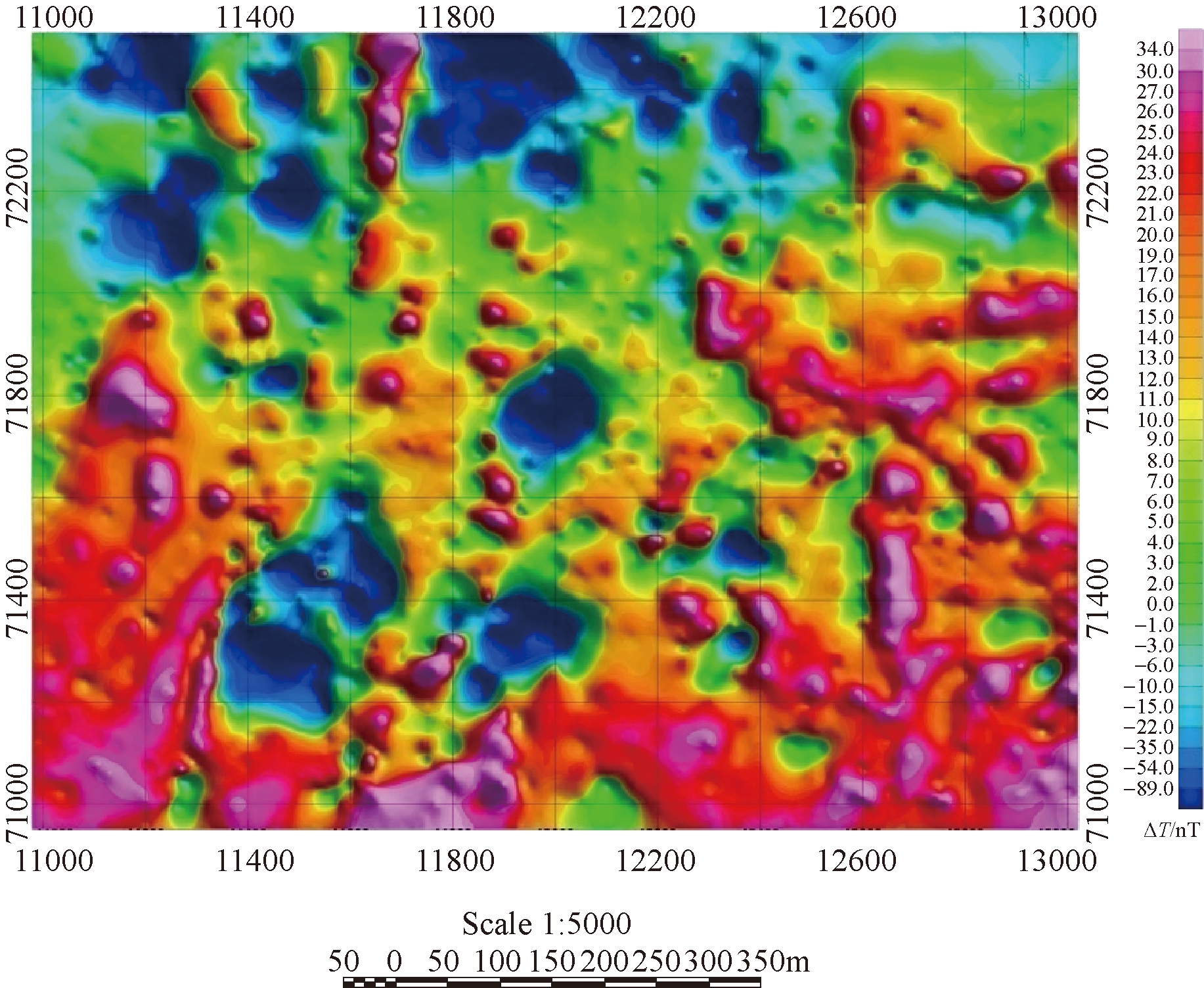 图2 煤层火区磁异常示意图 磁法探测的依据:国家地质矿产行业标准《地面高精度磁测技术规程》(DZ/T 0071-93),国家石油天然气行业标准《地面磁法勘探技术规程》(SY/T 5771-2004)。物探网布设采用三大常用坐标系之一的北京54坐标系(BJZ54),横轴墨卡托投影,中央子午线为112°30′,按1.5°分带;平面精度为±1cm+1ppm,高程精度为±2cm+1ppm。 2.3 磁法探测工作方法2.3.1 仪器性能测定试验 试验选用GSM-19T型质子磁力仪(加拿大产),为有效发挥仪器性能,达到试验精度和工程精度要求,测量前做好准备工作,并进行仪器的噪声水平、一致性等试验,如有明显系统误差和观测均方误差达不到设计精度的仪器,应查明原因,必须重新进行调节和检验[11]。 磁法探测试验期间的日变台站布置于露天矿台阶平盘的平稳磁场内,安排在干扰较小的时间段测试,有效日变观测取其平均值,作为本区的基本场T0,其基本场值为:54343.15 nT。 2.3.2 野外磁法探测数据预整理 (1)日变改正。剔除测点无效数据,利用专用软件自动改正。 FT=F观-F日 (1) 式中:FT——日变后的磁力值,nT; F观——日变观测磁力值,nT; F日——日变改正值,nT。 (2)地磁场的正常梯度改正和高度改正。采用国际地磁参考场(IGRF)2010模型提供的高斯系数,计算工区地磁场T0值,取1 nT的间隔绘制T0等值线图,以此图做正常场梯度改正。 野外磁测观测数据经过日变、正常场纬度改正、高度改正等之后,绘制出全区ΔT磁异常平剖图见图3。采用Kriging网格化原始磁异常数据,得到全区ΔT磁异常等值线图见图4。