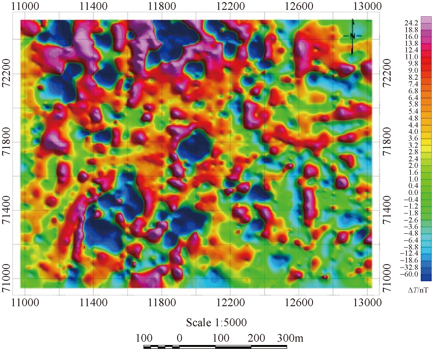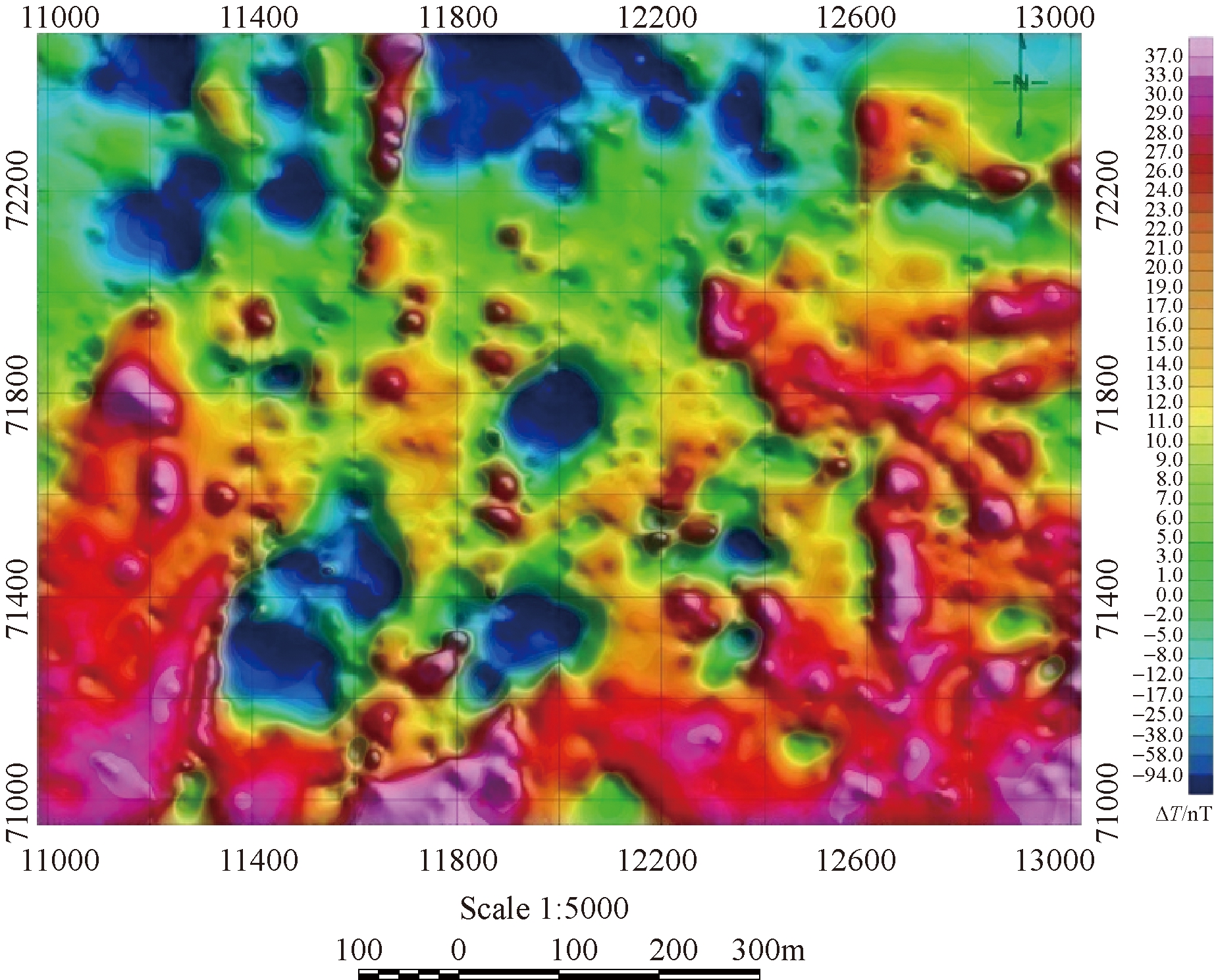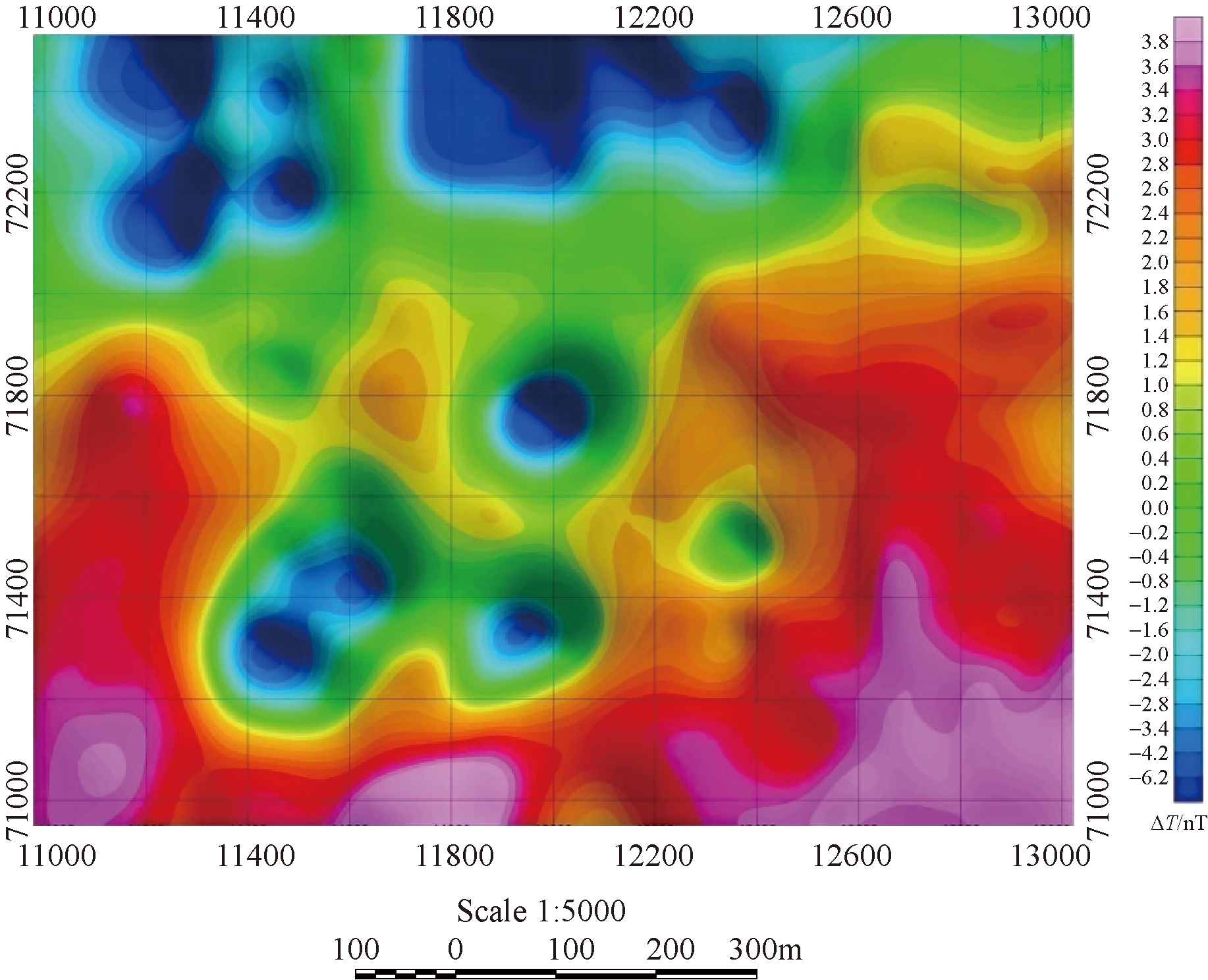 图3 工区高精度磁测ΔT异常平剖图
