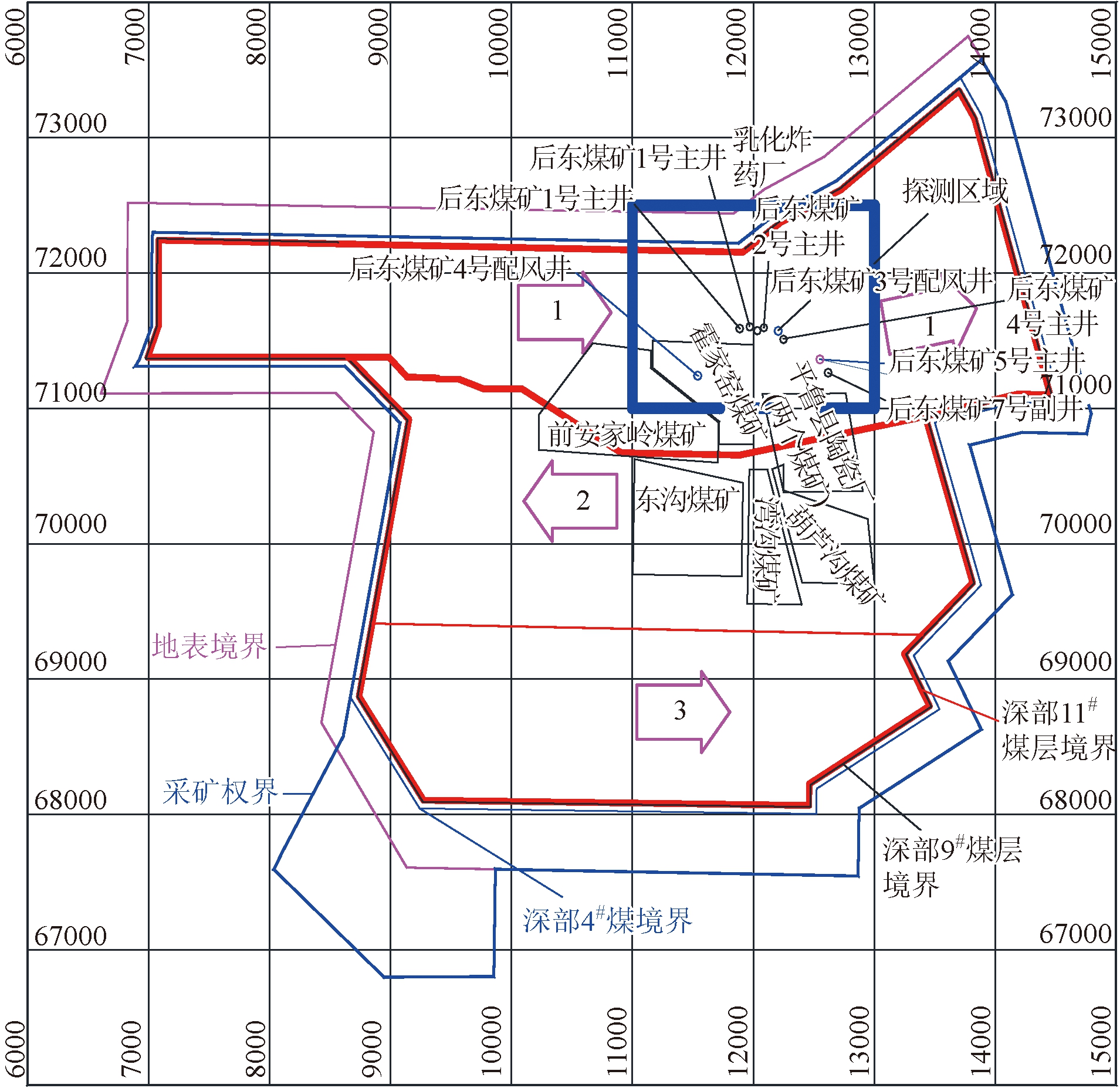 ★ 科技与工程 ★ 露天煤矿井工采空区火区磁法探测研究安家岭矿是我国特大型露天煤矿,境界内分布着井工开采后已经闭井的后东煤矿和白西沟煤矿,均采用房柱式开采法一次采全高,回采率偏低,煤炭损失严重。2个矿井的开采资料不全而且本身有越界开采现象,造成现有资料与井下实际位置不对应。井工矿开采形成的塌陷具有隐蔽性,且空巷内滞留大量易燃、易爆、有毒气体(如CO、CH4)。露天矿山工程推进和延深中存在以下潜在的风险:开采煤层采空区的塌陷易造成设备、人员陷入,造成伤害事故;采空区残煤自燃,给其上岩石台阶的钻孔、爆破作业带来风险,而且导致炸药单耗高,影响露天矿剥采效益;自燃造成的高温可能烫伤作业人员、引起汽车轮胎自燃、降低设备寿命等。为规避各种危害,确保安全生产,需要对露天矿境界内井工采空区(火区)进行采前探测,对于露天煤矿井工残煤复采、安全生产具有重要的现实意义[1]。 磁法是目前应用于煤火勘探最为广泛的方法,由于火区的磁异常形态客观地反映了烧变岩特征和自燃边界的异常特征,可有效圈定煤层火区边界[2]。隐蔽的高温区域埋深信息反演困难,难以准确推断。鉴于此,利用钻探验证磁法圈定的火区边界,合理确定火区埋深。 1 磁法勘探区域位置与测线布置1.1 矿田的开发现状安家岭矿的矿山工程于1997年11月开始建设,原设计能力为10.00 Mt/a,扩建后的生产能力为20.00 Mt/a。目前在本矿南部有2个井工煤矿生产,分别为东易煤矿和平朔安家岭西易有限公司,均采用斜井开拓,走向长壁回采;瓦斯含量少,属于低瓦斯矿;井下水文地质条件简单,一般无水,顶板易管理。 1.2 区域地层(1)区域地层与地质构造。矿田位于宁武煤田北部,基岩为古老的变质岩系。地层基本上是一个向南东方向倾斜的单斜,中部地层平缓,东部构造较西部复杂,矿田东部揭露的断层共20条,甚至多为高角度的正断层[3]。 (2)可采煤层。矿田含煤地层为石炭系太原组及二叠系山西组,山西组地层平均厚度为49.90 m。太原组地层平均厚度为90.37 m,含煤10层,煤层总厚度为32.38 m,主采煤层为4#、9#、11#煤层。4#煤层厚度较大,埋深较浅,在北部受小窑采空区影响部分自燃。 1.3 磁法勘探区域位置与测线布置勘探区位于安家岭矿区内,坐标为南北71000~72500 m,东西11000~13000 m,区域面积约3 km2,如图1所示。由于资料不清,对于采空区上部覆盖层厚度超过35 m的疑似区域,进行火区磁测勘探。采剥设备及电缆调整布置至50 m的警戒范围外。