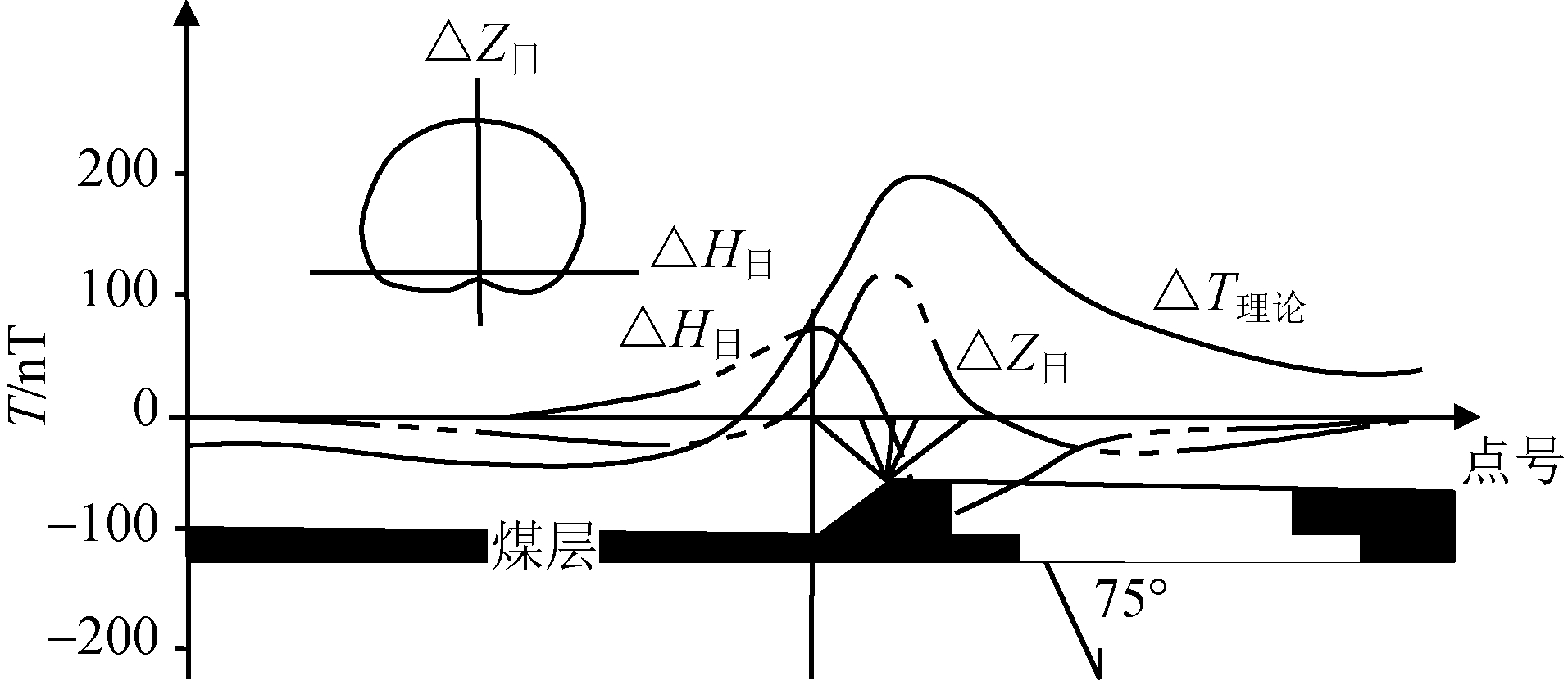 图1 矿区磁法勘探区示意图 探测区采用矩形测网,网度为50 m×20 m,测线方位为南北方向。 2 勘探原理与方法2.1 磁法勘探火区的原理由于煤田地层是沉积形成的,可以假设它为板状体,地层的层序状态可以看作为水平或者近水平[4]。地层中的含铁矿物在烧变之后有可能转化为磁铁矿,如果有断裂等构造贯通煤层时,造成氧气流入使其燃烧更甚[5-8]。在燃烧过程中煤火温度一般都在800℃以上,煤层火区围岩受到强烈的高温烘烤而形成烧变岩,烧变之后的部分岩层表面光泽,质地坚硬,这种现象属于热剩磁现象,烧变之后含铁矿物具有高磁化率。其机制是围岩从居里点温度(约770℃以上)逐渐冷却到居里点以下时所显现的磁性。由于热剩磁作用导致与周围岩石之间有较明显的磁性差异。该过程具有高磁化过程,其磁化率常见值为1286π×10-6 SI制单位,一般表现为正磁异常(见图2)。磁异常曲线体现的特征:含煤区未经磁化的磁场背景平稳,而由于热剩磁形成的火区则表现出明显磁异常[9],这是煤层火区边界位置的解释依据。 2.2 磁法探测技术应用磁法探测的应用条件是磁测体必须与围岩有较明显的磁性差异;磁异常应在磁力仪观测精度范围内;磁异常能够从干扰背景中分辨出来而不失真,或能够直接消除干扰因素。