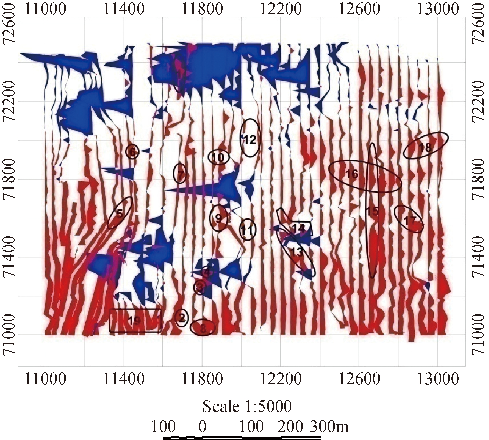 图7 工区匹配滤波能谱图 4.1 疑似火区范围推断通过高精度磁测,绘制出野外磁测19个磁异常点分布见图10。工区内共圈出明显异常区4个(M1~M4),分析如下所述。 M1异常区:位于西北部,由1、6、5点圈定,异常断续近南北向狭长分布,异常极大值为50 nT(18、5线),正、负异常跳跃变化,呈锯齿形分布,北部出现大面积负异常,疑似火区埋藏浅,异常强度降低。 M2异常区:位于西南部,由2、3、4、8、19点圈定,异常分布近似南北转为向西带状延申。异常极大值为90 nT(35线),东北部出现大面积负异常埋深较浅,磁场变化不大,疑似火区连续。