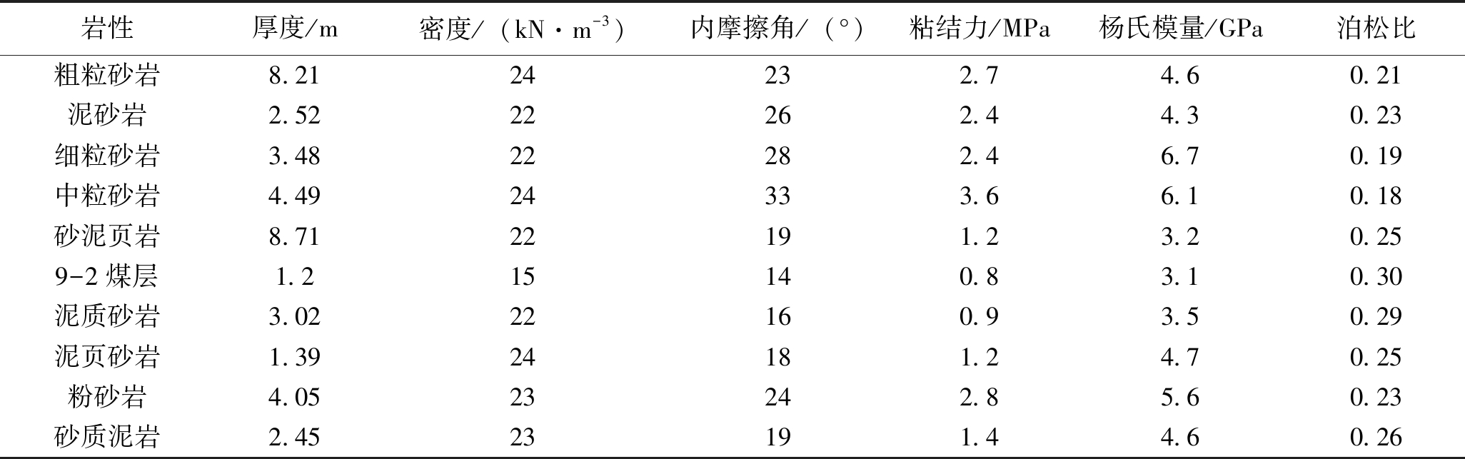 图1 沿空留巷示意图 1 充填支护墙体宽度和水灰比确定为了详细分析李堂煤矿沿空留巷巷旁充填支护墙体合适宽度,根据李堂煤矿92102轨道巷生产地质条件,利用FLAC3D模拟分析充填体及围岩的应力分布特性及塑性变化等情况,研究确定巷旁充填体宽度。 根据实际地质情况,模拟煤层厚度1.2 m,计算模型尺寸(长×宽×高)为150.55 m×72 m×39.52 m,上部边界压力按采深600 m计算,巷道尺寸(宽×高)为3.4 m×2.4 m(中线),数值计算模型岩石性能及力学参数见表1。 表1 岩石性能及力学参数