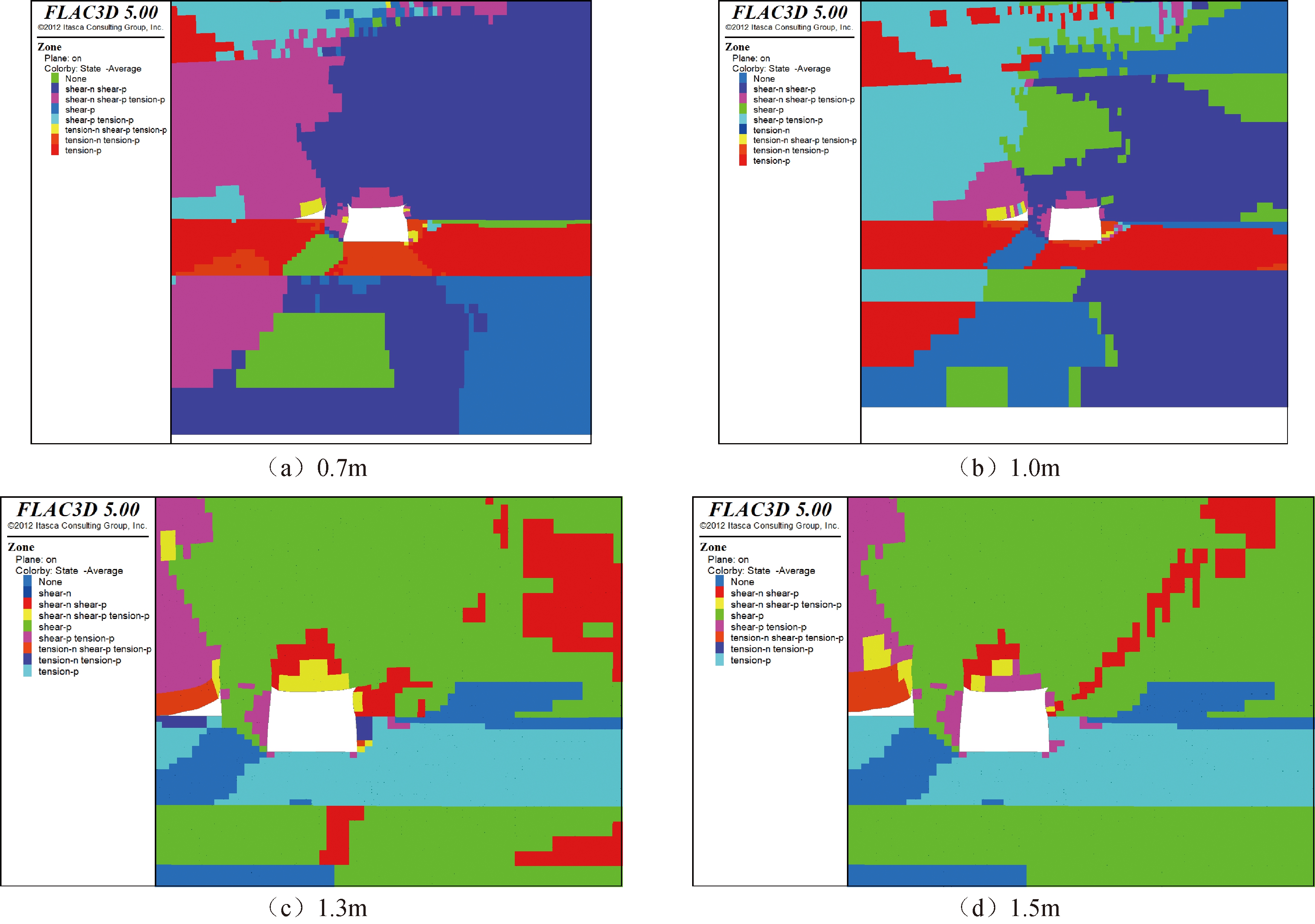 岩性厚度/m密度/(kN·m-3)内摩擦角/(°)粘结力/MPa杨氏模量/GPa泊松比粗粒砂岩8.2124232.74.60.21泥砂岩2.5222262.44.30.23细粒砂岩3.4822282.46.70.19中粒砂岩4.4924333.66.10.18砂泥页岩8.7122191.23.20.259-2煤层1.215140.83.10.30泥质砂岩3.0222160.93.50.29泥页砂岩1.3924181.24.70.25粉砂岩4.0523242.85.60.23砂质泥岩2.4523191.44.60.26 1.1 充填支护墙体宽度确定模拟充填支护墙体宽度在0.7 m、1.0 m、1.3 m、1.5 m情况下,巷道受采动影响时围岩应力云图情况见图2。 由图2可知,在巷道范围内,充填支护墙体宽度为0.7 m时,顶板应力较大,顶板中部在围岩压力作用下产生了破坏应力,巷道顶板产生了拉应力,塑性区范围较大;充填体宽度为1.0 m、1.3 m、1.5 m时顶板整体性较好。在充填支护墙体范围内,充填支护墙体中间部位应力高于两侧,且充填支护墙体宽度为0.7 m时,最大应力不大于原岩应力,宽度在1.0~1.5 m时,充填支护墙体完整性较好,应力分布较均匀。 模拟充填支护墙体宽度在0.7 m、1.0 m、1.3 m、1.5 m情况下,巷道受采动影响时巷内塑性区分布见图3。
