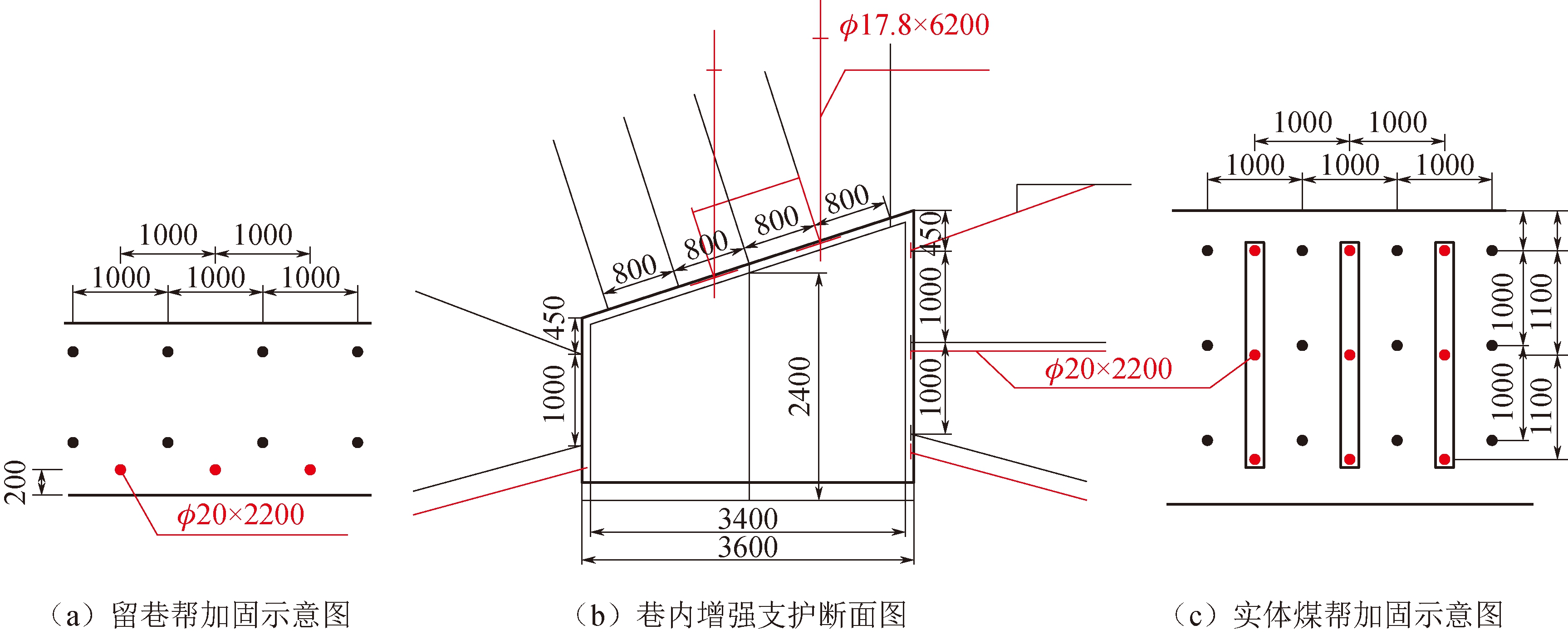 图3 充填支护墙体不同宽度巷道及充填支护墙体塑性区图 由图3可以看出,不同充填支护墙体宽度下,巷道受力破坏的方式相同,都是以剪切破坏为主。当巷旁充填支护墙体宽度为0.7 m时,巷道围岩产生较大应力形变,且表面出现较高的应力,产生了拉应力破坏,而充填支护墙体上方顶板破坏表面与巷道顶板不是垂直,有一定夹角,由于发生了剪切性的破坏,此时上覆岩层发生明显的旋转下沉;巷旁充填支护墙体宽度为1.0 m时,此时巷道围岩变形量明显变小,充填支护墙体在切断顶板后较为稳定,巷内顶板和实体煤帮受拉应力破坏产生的塑性区范围变小,顶板下沉量也减小,整体塑性区范围明显减小;巷旁充填支护墙体宽度为1.3 m时,与宽度为0.7 m时比较,巷道变形量及塑性区有明显减小,但与巷旁支护体宽度1.0 m比较没有明显变化;当巷旁充填支护墙体宽度为1.5 m时,此时充填支护墙体及巷内顶板的变形量及塑性范围较小,且巷内围岩由张拉破坏变为剪切破坏,说明此时巷内支护较为稳定,围岩破坏以挤压剪切为主。 通过采用数值模拟软件对上述沿空留巷巷旁充填支护墙体不同宽度的研究分析,得出了充填支护墙体与巷道的应力分布和塑性区范围,并对不同的结果进行了比较,支护体的宽度在0.7 m时,墙体及巷道变形较大,巷道的维护状况不良;充填支护墙体宽度在1.0 m时,形变量不大,塑性范围较小,为合理的宽度;支护体在1.3 m和1.5 m时,形变量与宽度为1.0 m相比变化不大,但考虑到留巷成本较大在经济上不合理,故不予考虑。综合该矿的生产经营情况,最终得出巷旁留巷合适的充填支护墙体宽度为1.0 m。 1.2 数值模拟结果分析数值分析计算表明:巷旁充填支护墙体的宽度太小会严重影响留巷的维护效果。由巷旁充填支护墙体变形和留巷变形受控的情况分析,当巷旁充填支护墙体宽为1.0 m时可以保障较好的巷道控制效果。 综上所述,巷旁充填支护墙体的宽度为1.0 m时,采煤侧充填1.0 m,留巷后巷道宽度3.4 m、高度1.4 m,巷旁充填支护墙体与沿空留巷围岩稳定,能够满足沿空留巷使用要求。 2 工业性试验2.1 巷内增强支护沿空留巷需要经历两次工作面采动的影响,顶板活动强烈,为控制沿空留巷顶板,提高留巷效果,需在现有锚杆支护的基础上进行增强支护,具体增强支护方案如下: 采用ø17.8 mm×6200 mm的预紧应力锚索对巷道的顶板进行增强支护,锚索每排两根,间排距为1600 mm×1200 mm,每根锚索分别采用一支CK2340药卷和两支Z2360药卷,每根锚索采用长×宽×厚为300 mm×300 mm×16 mm钢托盘和一锁套,锚索安装预紧应力不小于195 kN,锚索锚固力不小于380 kN;实体煤帮及留巷帮下部采用ø20 mm×2200 mm的螺纹钢锚杆加强支护,巷内增强支护布置如图4所示。