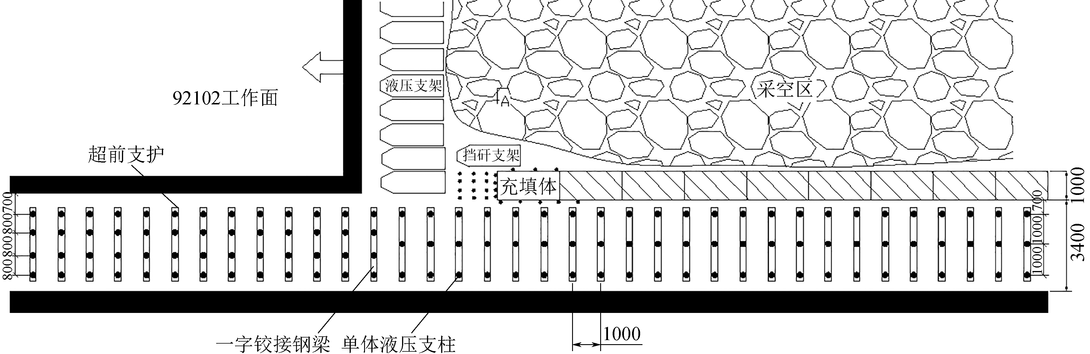 图4 92102轨道巷巷内增强支护布置图 2.2 留巷段辅助加强支护方案由于沿空留巷顶板受多次采动影响,顶板活动比较剧烈,因此需要对该段进行增强支护,结合现场巷道状况,采用单体液压支柱进行增加支护。根据该工作面生产地质状况和行业规程要求,在工作面后100~120 m范围内铺设倾向架棚,倾向架棚由单体液压支柱和一字铰接顶梁组成,每排3根,间排距均为1.0 m,在工作面前方25~30 m范围内安设倾向架棚,倾向棚子由单体液压支柱和铰接梁组成,每排4根,间排距为800 mm×1000 mm,同时在充填支护墙体采空区侧安设挡矸支架作为临时支护。单体液压支柱加强支护如图5所示。