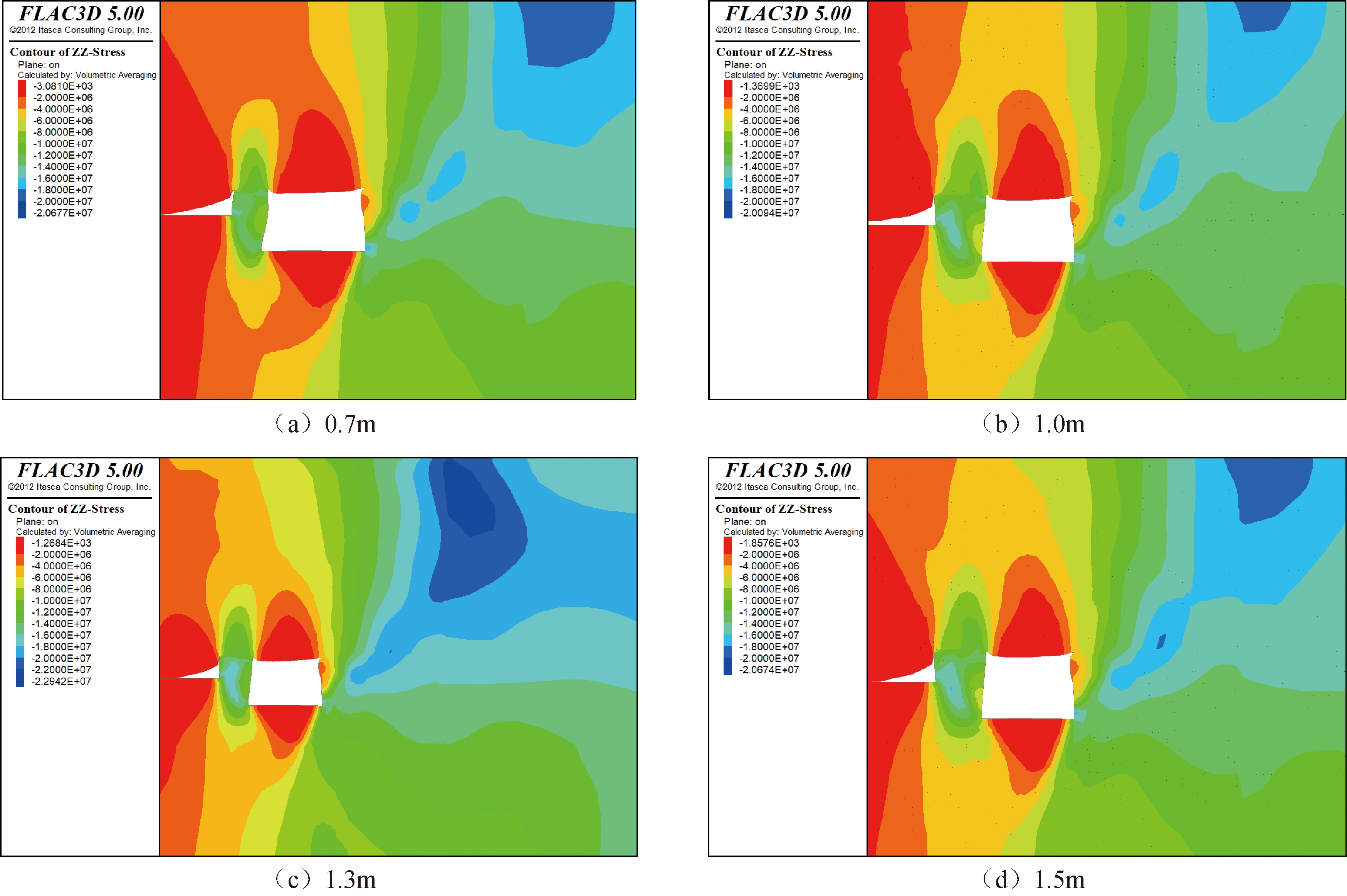 图2 充填支护墙体不同宽度巷道围岩及充填支护墙体应力云图