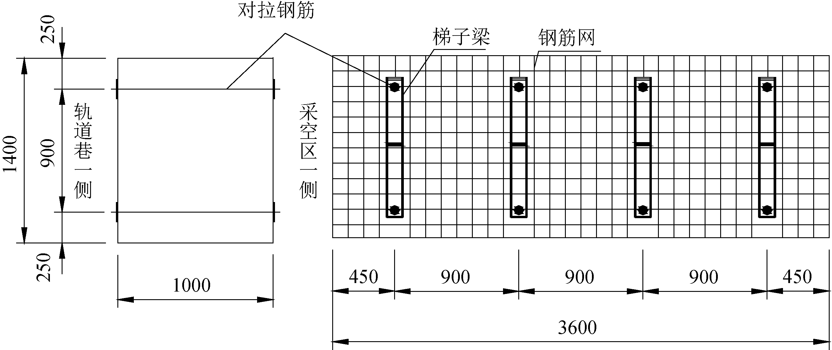 图5 留巷段辅助加强支护 2.3 充填支护墙体成型技术为了增加充填体的承载能力和抗横向变形能力,在充填体内布置对拉锚杆加固充填体,对拉锚杆间排距为900 mm×900 mm,最下面1根距底板250 mm,最上面1根距顶板250 mm,对拉锚杆采用ø20 mm螺纹钢材料制作,托盘规格(长×宽×厚)为150 mm×150 mm×10 mm。采用ø14 mm圆钢焊制的钢筋梯子梁,钢筋网要求使用ø6.5 mm钢筋加工,使用12#铁丝双股联网,钢筋网搭接部分不小于100 mm。充填体加固方案如图6所示。
