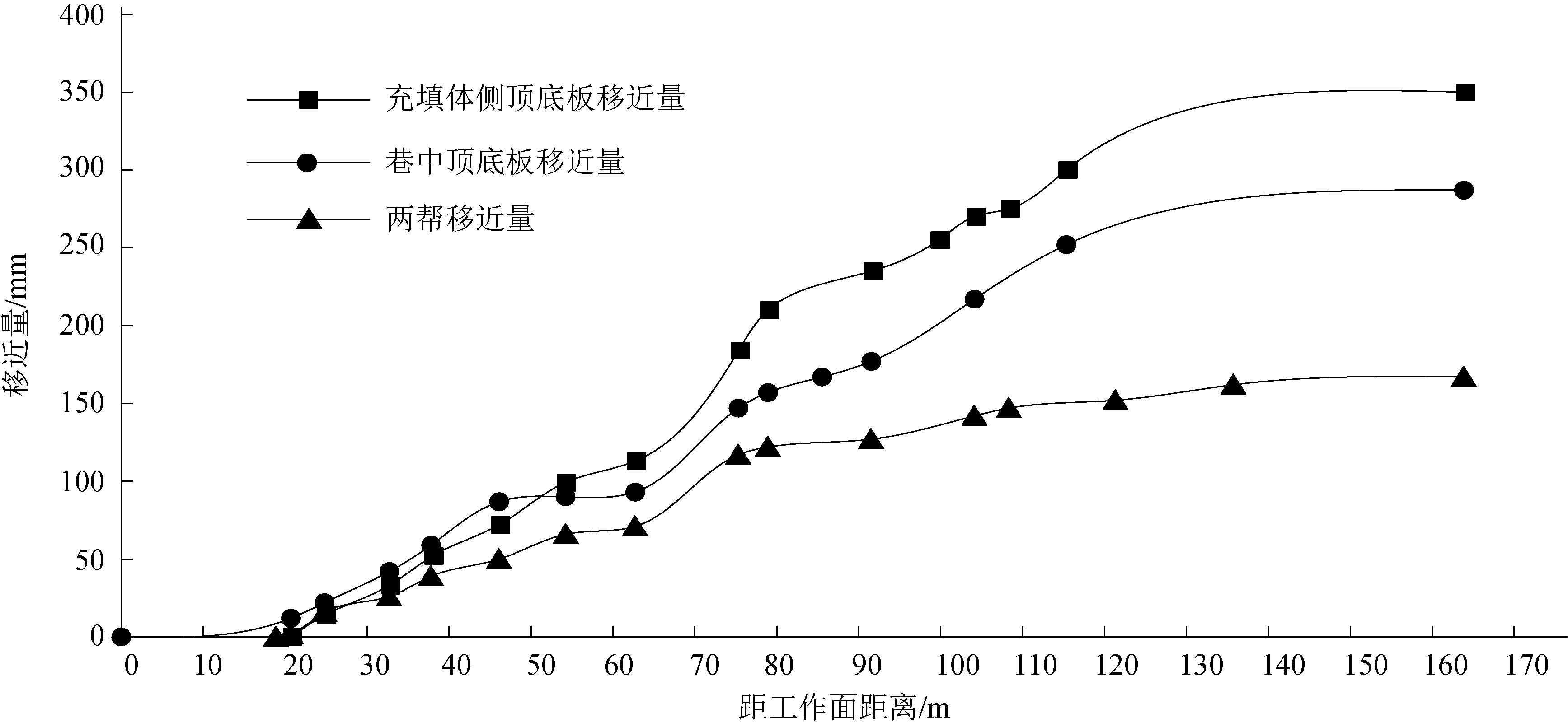 图6 充填支护墙体成型及加固方案 2.4 位移监测对巷道围岩位移进行监测,每隔10 m记录一次充填体侧顶底板移近量、巷道中部顶底板移近量和两帮移近量。巷道围岩位移监测结果如图8所示。 由图8可知,采用充填墙体支护后,巷道顶、底板相对位移量较煤帮相对位移量要大,而从整体数值来看,数值变化量不大,说明围岩整体的绝对移近量不大。由此可以推断,充填支护墙体对上覆岩层起到了较好的支撑作用,有效防止了围岩松动圈的进一步扩大。 根据巷道位移数据的分析,可以将围岩的变形分为4个阶段:围岩的变形首阶段为0~20 m范围,此范围内充填支护墙体凝结时间短、强度处于成长阶段,受采动影响变形剧烈;围岩变形第2阶段为20~55 m范围,此范围内充填支护墙体发挥了承载作用,充填支护墙体利用自身强度切断了基本顶,巷道四周的应力改变后再分布,变形趋向稳定;巷道变形的第3段为55~115 m的范围,上位顶板被充填支护墙体切断后,围岩应力重新分布,此时上位岩层在采空区冒落矸石、充填支护墙体和巷内支护的共同作用下趋于稳定;围岩变形第4阶段为120 m以后,此阶段顶板活动趋于稳定,围岩变形速度较小、变形量也较小,为留巷稳定阶段。