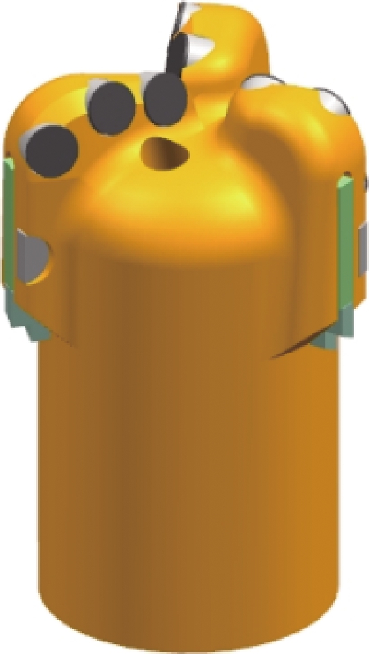 ★ 科技与工程 ★ 熔模铸造弧角型PDC钻头的研究与应用Tian Hongjie. Research and application of investment casting arc angle PDC bit [J].China Coal, 2020,46(5):109-112. Research and application of investment casting arc angle PDC bit弧角型PDC钻头是一种特殊结构的金刚石复合片钻头,由于具有流线型的冠部曲线、齿窝包镶性好和分层错峰布齿等结构特点,在煤矿井下钻孔施工中具有较高的钻速和较长的寿命,得到了市场越来越多的关注和应用。然而,由于弧角型PDC钻头曲面结构复杂,刀翼上每个切削齿具有不同空间角度,必须借助于五轴加工中心才能完成整个钻头体的加工,导致加工成本高、效率低。因此,为了适应市场需求急需寻求一种既可靠又高效的弧角型PDC钻头制造方法[1-3]。 熔模铸造是一种少切削或无切削的精密铸造工艺,具有精度高、表面质量好、可实现复杂铸件成型等特点,在汽车、机械制造、仪器等行业得到广泛应用。采用熔模铸造工艺生产的零件不仅可以大幅度节约金属原料,还可节省大量机床设备和加工工时。基于以上优点,笔者针对熔模铸造工艺在弧角型PDC钻头制造中的应用进行了技术研究,研究发现采用熔模铸造工艺制造弧角型PDC钻头不但可以使钻头中的复杂曲面一次铸造成型,提高钻头体的一致性、较好地控制钻头质量,而且可以大大提高生产效率,降低制造成本[4-7]。 1 弧角型PDC钻头及铸造模型的结构设计1.1 弧角型PDC钻头结构设计弧角型PDC钻头是一种刮刀式PDC钻头[7],结构设计采用刀翼式结构。钻头冠部曲线设计为短抛物线结构,并根据钻进地层情况设计合理的内锥角,切削齿按照错缝布齿原则分布在冠部抛物线上。刀翼及水口采用流道结构设计,为了适当降低制造难度并增强钻头的排屑能力,刀翼结构选用三翼直刀翼结构,水口顶端设计为圆弧结构,减小排屑阻力,在保证钻头强度的情况下尽可能缩小水口直径,保证较大的排屑空间。采用这种方法设计的弧角型PDC钻头,不但切削齿自由面多、单齿切削量小、有利于快速切削岩石,而且刀翼式的钻头结构使得钻头排屑能力强,钻头不容易磨损。弧角型PDC钻头结构如图1所示。