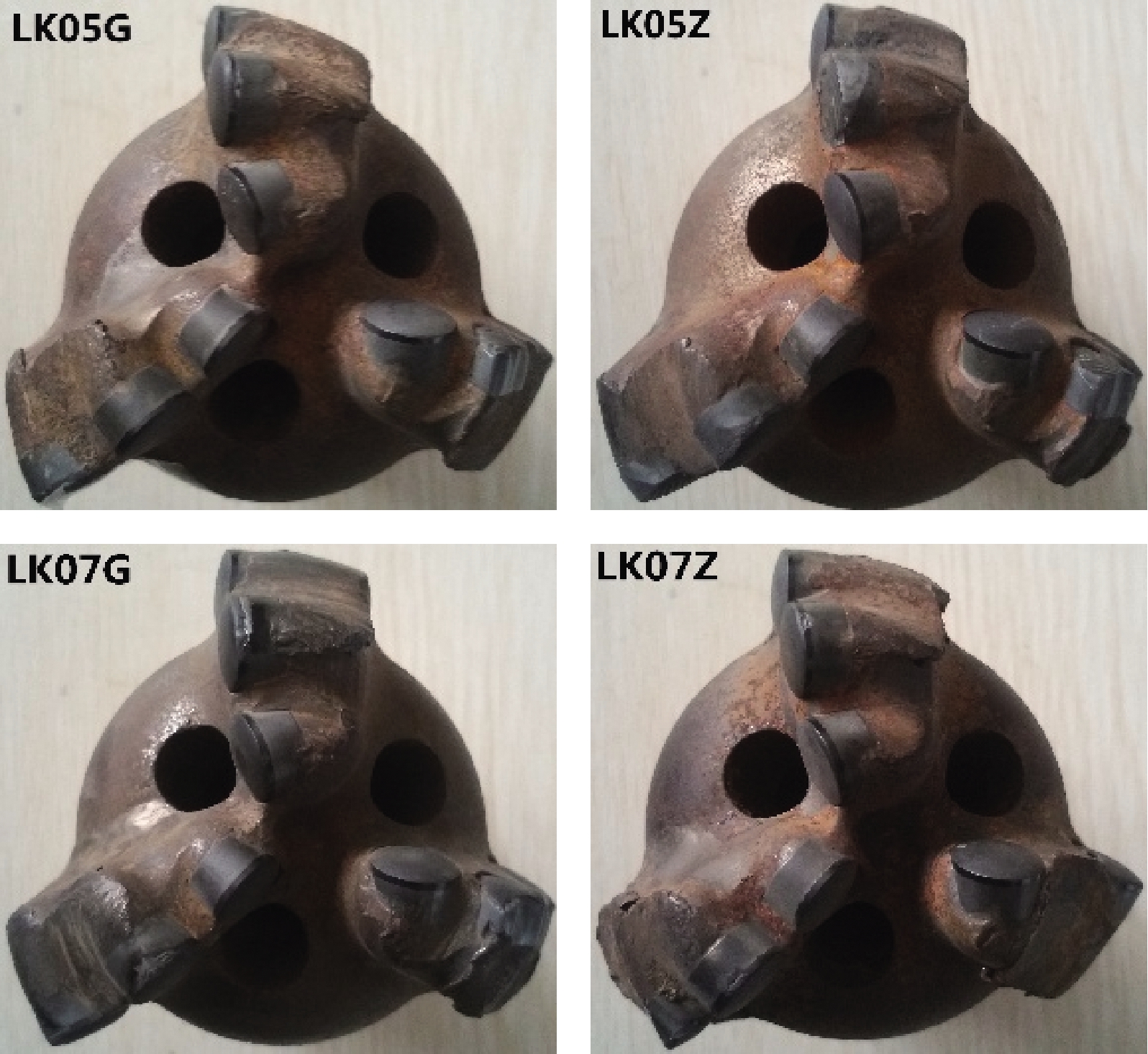 加工工艺钻头编号钻速/(m·h-1)总进尺/m平均进尺/m备注熔模铸造弧角型PDC钻头LK05Z8.5460LK07Z10598529岩石段423 m岩石段498 m普通机械加工弧角型PDC钻头LK05G10571LK07G8461516岩石段479 m岩石段420 m 由表2可以看出,两种类型钻头的平均钻速和平均进尺没有明显差别。熔模铸造弧角型PDC钻头平均进尺达到529 m,平均钻速为9.25 m/h,2只钻头共计施工钻孔23个,其中每个钻头的前1~6个孔,平均钻速可达16.5 m/h,后段随着钻头的磨损钻速逐渐降低。普通机械加工弧角型PDC钻头平均进尺为516 m,平均钻速为9 m/h,2只钻头共计施工钻孔24个。熔模铸造与普通机械加工弧角型PDC钻头试验后的损坏情况如图4所示。