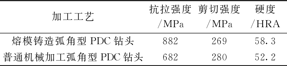 图3 熔模铸造弧角型PDC钻头及内部剖面 铸造后退火热处理采用850℃/5h+炉冷的工艺,退火后进行室温拉伸、剪切强度和硬度等力学性能试验。试验时各测3个试样取平均值,力学性能数据对比见表1。 表1 力学性能对比