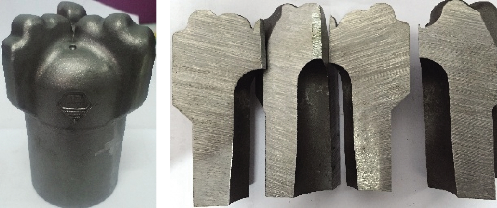 图2 弧 角 型PDC钻头铸造毛坯 2 试铸及力学性能测试采用熔模铸造工艺对弧角型PDC钻头进行试铸,材料选用35CrMo,蜡模采用3D打印成形。试验发现,相比机械加工,采用熔模铸造工艺制造的弧角型PDC钻头,大大提高了生产效率,降低了设备利用率,缩短了生产工艺链条。试铸完成后随机抽取若干只钻头,分别沿不同截面切开,对其内部进行宏观缺陷检测。检测发现,钻头成型较好,外表面和内部没有明显肉眼可见的夹砂、气孔、缩松等缺陷。熔模铸造弧角型PDC钻头及内部剖面如图3所示。