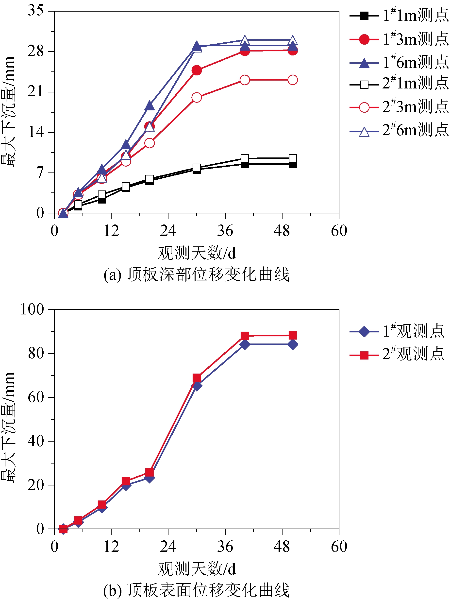 图5 无超前支护情况下巷道顶板监测线的垂直位移曲线