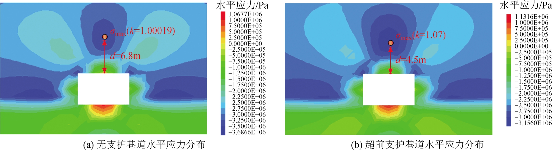 图3 巷道过破碎带超前钢管支护数值计算模型 2.3 超前支护参数对巷道顶板应力分布的影响规律为分析超前支护参数对破碎区巷道顶板应力分布与围岩稳定性的影响规律,定义表征巷道顶板水平应力分布的两个特征参数k和d,如图6所示。其中,k表示顶板水平应力集中系数,取巷道顶板应力集中区中的最大水平应力与原岩应力的比值;d表示顶板水平应力集中区的位置,取巷道顶板应力集中区中的最大水平应力点到巷道顶板表面的距离。从图6中可以看到,采用超前支护以后,破碎区中巷道顶板应力集中区距离巷道表面距离d减小,且应力集中系数增大,这表明了采用超前支护后巷道浅部围岩的承载能力得到了提高。