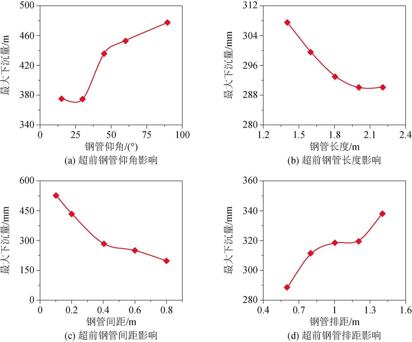 图7 不同超前支护参数影响下破碎区巷道顶板水平应力分布特征参数(k和d)的变化规律 2.4 超前支护参数对巷道顶板变形破坏特征的影响规律不同超前支护参数影响下的破碎区巷道顶板最大下沉量的变化规律如图8所示。从图8(a)中可以看到,随着超前钢管仰角的逐渐增大,破碎区巷道顶板最大下沉量表现出先减小后增大的趋势。当超前钢管仰角为30°时,此时巷道顶板下沉量最小(最大下沉量约374 mm)。这表明,过大或过小的超前钢管仰角对巷道顶板维护都是不利的,最佳的钢管布置仰角约30°。 从图8(b)可以发现,随着超前钢管长度的增大,破碎区巷道顶板最大下沉量逐渐减小。当超前钢管长度超过2 m以后,继续增加钢管长度对顶板的最大下沉量影响很小。这表明,过长的超前钢管并不能显著地提高围岩浅部锚固体的承载能力,最佳的超前钢管长度为2 m左右。 从图8(c)和图8(d)可以发现,随着超前钢管布置间距、排距的增大,破碎区巷道顶板最大下沉量也逐渐增大。这表明,越小的超前钢管间排距布置越有利于保持顶板围岩的完整性和承载能力。结合数值模拟结果,同时考虑到巷道的掘进效率与支护成本,最佳的超前钢管布置间距取值为0.1~0.3 m,排距取值为0.6~1.2 m。