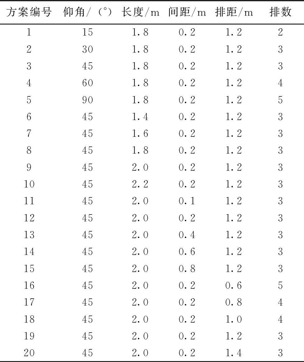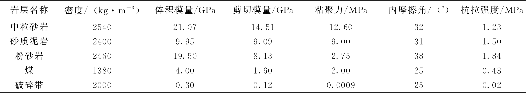 岩层名称密度/(kg·m-3)体积模量/GPa剪切模量/GPa粘聚力/MPa内摩擦角/(°)抗拉强度/MPa中粒砂岩254021.0714.5112.60321.23砂质泥岩24009.959.099.00311.50粉砂岩246019.508.132.75381.84煤13804.001.602.00250.43破碎带20000.300.120.0009250.02 表2 超前钢管支护参数数值模拟方案