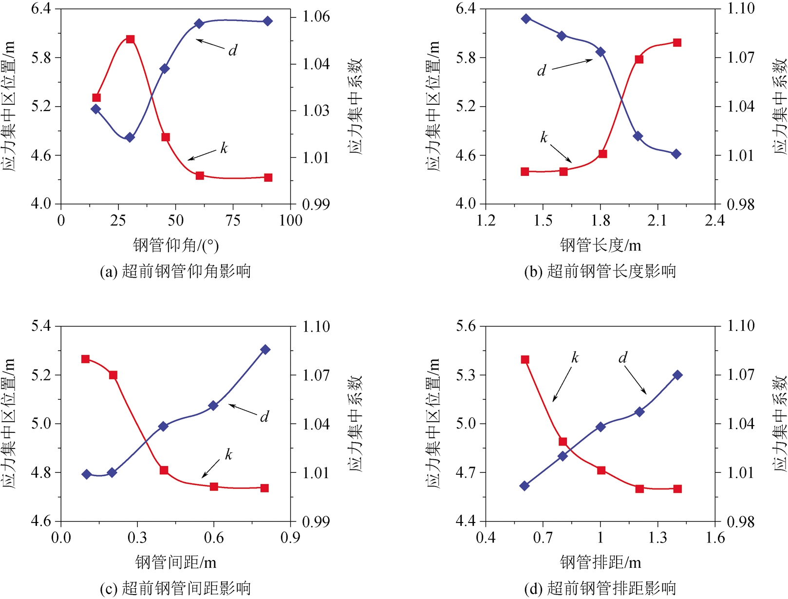 图6 巷道顶板水平应力分布特征参数的定义 图7进一步给出了不同超前支护参数(包括钢管仰角、钢管长度、钢管间距、钢管排距等)影响下巷道顶板水平应力分布特征参数(k和d)的变化规律。从图7(a)可以看到,随着钢管仰角的增大,巷道顶板水平应力集中系数k呈现出先增大后减小的趋势,而顶板应力集中距离巷道表面距离d呈现出先减小后增大的趋势。这表明随着钢管仰角的逐渐增大,超前支护对巷道顶板的控制作用是“先增强后减弱”。最佳的钢管布置仰角约为30°左右,此时巷道顶板的承载能力最高(k值最大,d值最小)。 从图7(b)可以发现,随着超前钢管长度的增加,k逐渐增大,而 d逐渐减小。这表明,超前钢管长度越长,对巷道顶板的控制作用越强。但是,当钢管长度增加到2 m后,进一步改变超前钢管的长度对k和d影响较小。 从图7(c)和图7(d)可以发现,随着超前钢管的间距和排距的增大, k逐渐减小,而d逐渐增大。这表明,超前钢管的间排距越大,其对顶板的控制效果越不利。