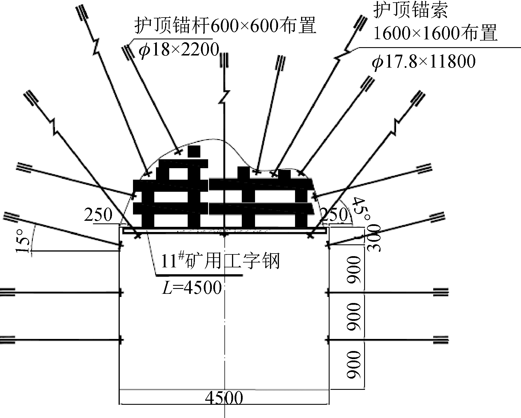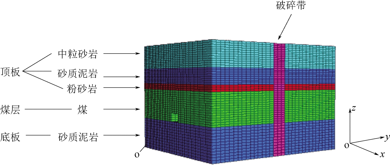 ★ 科技与工程 ★ 厚煤层掘进巷道过破碎带超前支护参数优化研究Liang Shaping, Lu Yinlong, He Mengqi, et al. Research on advance support parameter optimization for roadway driving through fracture zone in thick coal seam[J]. China Coal, 2020, 46(5):96-103. Research on advance support parameter optimization for roadway driving through fracture zone in thick coal seam在矿井建设与巷道开拓过程中,部分巷道不可避免地要布置在断层破碎带等不良地段[1-2]。这种断层破碎区域不仅围岩破碎,而且周围存在异常的构造应力场;附近煤岩体受其影响极易出现离层、破碎,甚至发生局部冒顶事故;从而给巷道掘进和支护带来极大困难,严重影响巷道围岩与支护结构的长期稳定及安全,已成为影响矿井正常安全生产的关键技术难题之一[3-4]。 目前,不少学者已对断层破碎区巷道围岩变形破坏机理进行了深入研究[5-6],得出巷道掘进过程中围岩应力、位移及支护结构的受力变化规律[7-8],揭示了断层破碎区巷道围岩的稳定性演化规律[9-12],并提出了超前锚杆预加固、大管棚超前支护、分布耦合支护等超前支护技术方案[13-14],应用中取得了一定的效果。但是,目前在断层破碎区巷道围岩超前支护参数的合理选择与优化方面仍需开展进一步的深入研究。 为此,结合山西韩家洼矿22#煤层二采区22205厚煤层运输巷掘进工作面过破碎带的具体工程地质条件,利用FLAC3D建立了厚煤层掘进巷道过破碎带超前支护的三维数值计算模型,系统研究不同超前支护参数对巷道围岩稳定性的影响规律,优化厚煤层掘进巷道过破碎带的超前支护参数,并在现场进行工程实践。 1 工程概况山西韩家洼矿22#煤层二采区22205运输巷的地面标高为1545~1573 m,井下标高为1265~1275 m。22#煤层平均煤厚11.5 m,顶板自下而上依次为2.3 m厚粉砂岩、5.7 m厚砂质泥岩和 8.8 m 厚中粒砂岩,底板为砂质泥岩。22205运输巷采用掘进机割煤,沿煤层底板掘进。巷道设计为矩形断面,巷道掘进宽度4.5 m,掘进高度3.0 m。 受地质构造的影响,22205运输巷顶板破碎严重,顶板煤层节理发育并伴有小断层,在掘进期间已多次出现破碎顶板伴随夹矸大面积垮落的现象,导致了巷道出现不同程度的超高,如图1所示,严重影响了巷道的快速掘进和矿井正常安全生产。 为了防止22205运输巷掘进过程中冒顶事故的继续发生,根据现场地质勘查资料,考虑对22205运输巷里程235~240 m处的顶板破碎段开展超前钢管临时支护试验。为科学合理地选择超前支护参数,采用FLAC3D对超前支护参数进行数值模拟优化研究,后在现场进行工程实践。