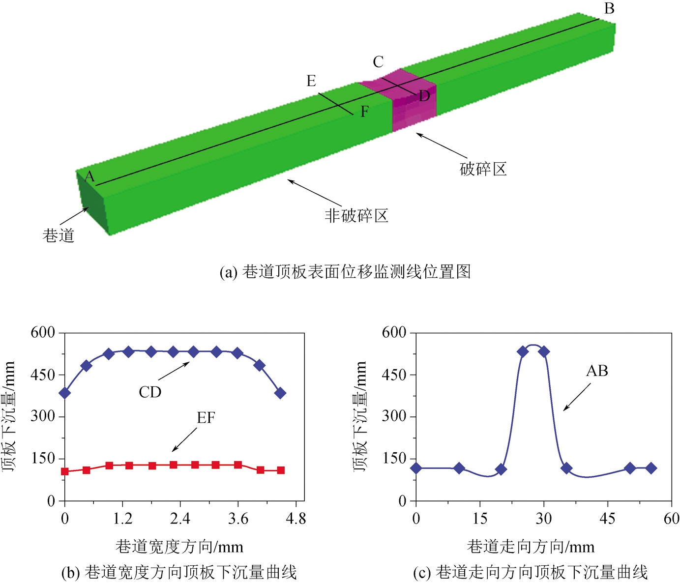 方案编号仰角/(°)长度/m间距/m排距/m排数1151.80.21.222301.80.21.233451.80.21.234601.80.21.245901.80.21.256451.40.21.237451.60.21.238451.80.21.239452.00.21.2310452.20.21.2311452.00.11.2312452.00.21.2313452.00.41.2314452.00.61.2315452.00.81.2316452.00.20.6517452.00.20.8418452.00.21.0419452.00.21.2320452.00.21.43 图5进一步给出了无超前支护时巷道顶板下沉量曲线。图5(a)中,AB、CD、EF为3条布置在巷道顶板表面的监测线,其中AB沿着巷道走向,CD和EF沿着巷道宽度方向(分别位于破碎区和非破碎区中)。从图5中可以看到,在非破碎区中巷道顶板下沉量较小,顶板处于稳定状态;而当巷道掘进至破碎区时,顶板下沉量急剧增大,最大下沉量约为非破碎区中的4.24倍,巷道顶板支护和维护变得十分困难。
