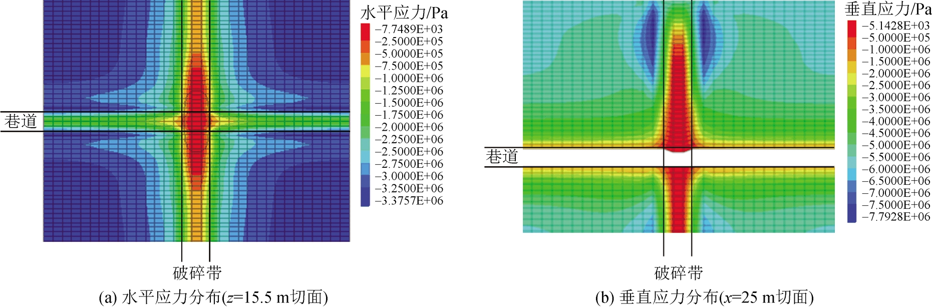图2 厚煤层掘进巷道过破碎带三维数值计算模型 模型尺寸为50 m×40 m×55 m,破碎带宽度为5 m,模型网格划分为99000个单元。模型选取摩尔—库仑本构模型,各岩层所用的计算参数如表1所示。数值计算模型中,超前钢管采用Cable单元按照全长锚固方式进行等效模拟,杆体横截面积为3.8 cm2,体积模量为45 GPa,最大拉伸极限为250 kN,锚固剂刚度为17.5 MPa,锚固剂粘聚力0.2 MPa。模型底部、两侧边界为法向位移约束,上边界受垂直地应力作用,大小为5.58 MPa。 当巷道掘进至破碎带时,采用超前钢管进行支护,巷道过破碎带超前钢管支护数值计算模型如图3所示。根据现场条件,选择直径为40 mm钢管,钢管的长度、间距、排距、仰角等参数对超前支护效果的影响通过数值模拟优化确定,具体的数值模拟方案如表2所示。 2.2 无超前支护巷道顶板变形破坏特征无超前支护时巷道顶板z=15.5 m处水平切面上水平应力分布云图和x=25 m处纵向切面上垂直应力云图见图4。从图4中可以看出,破碎带中巷道顶板的水平应力和垂直应力均明显比非破碎带区域的应力要小,且破碎带中巷道顶板的应力集中区到巷道表面位置较远,这表明破碎带中巷道顶板浅部围岩承载能力极小,极易在自重作用下发生冒落。 表1 数值模型中岩层物理力学参数