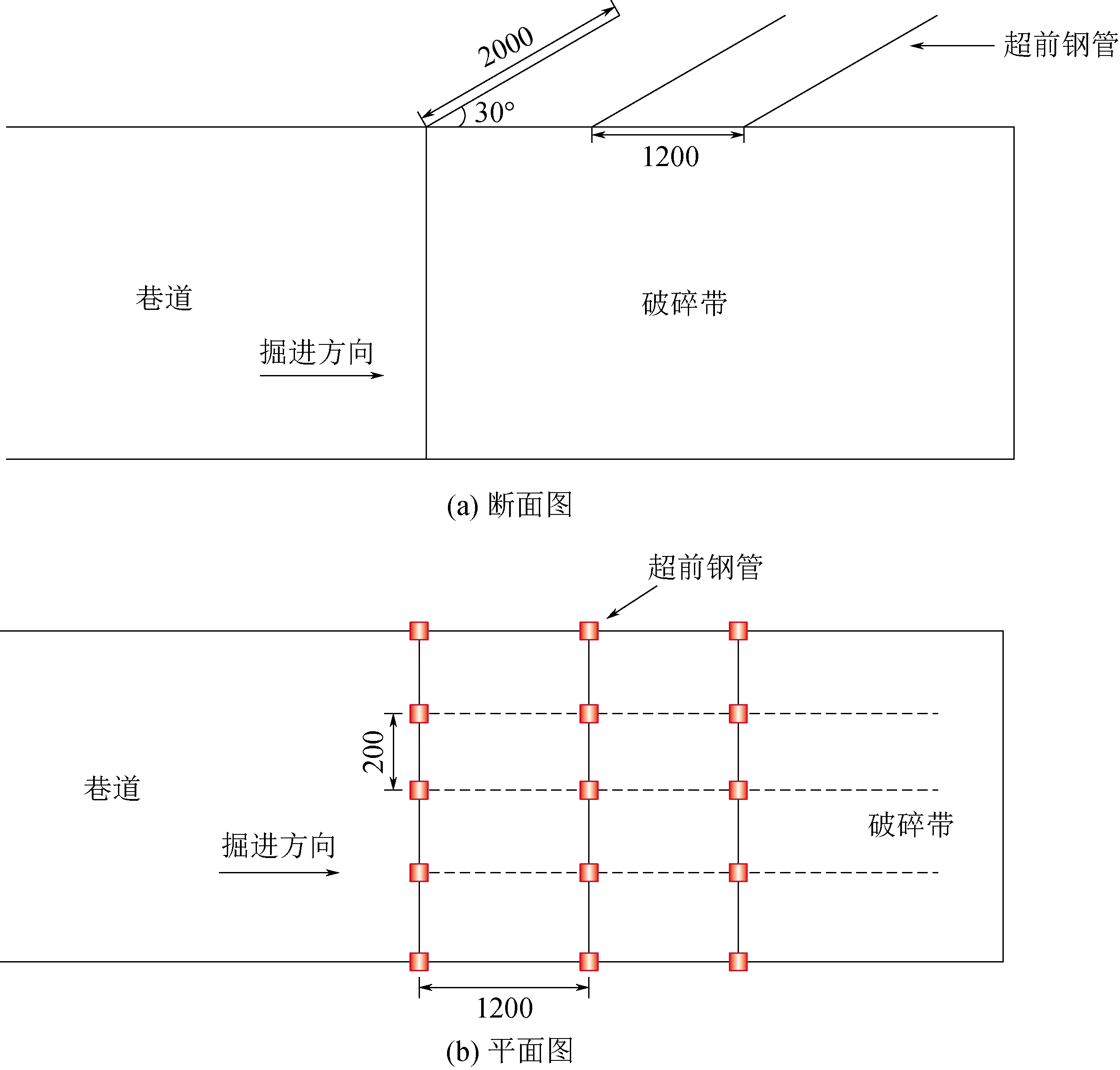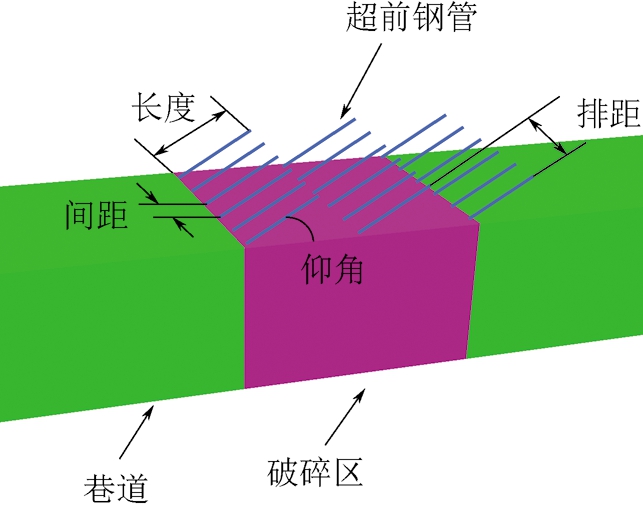 图8 不同超前支护参数影响下破碎区巷道顶板最大下沉量的变化规律 3 工程应用基于上述数值模拟分析结果,结合22205运输巷的具体工程地质条件与生产技术条件,提出了22205运输巷掘进巷道的超前钢管支护技术方案,如图9所示。