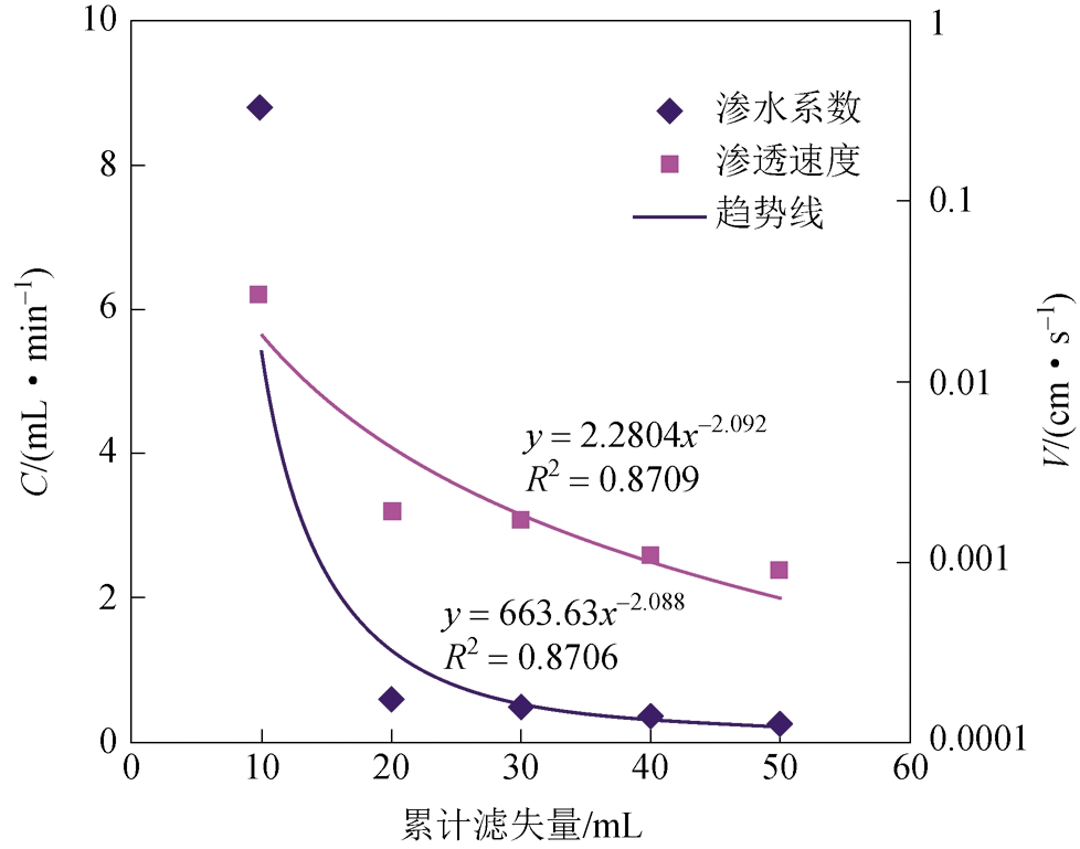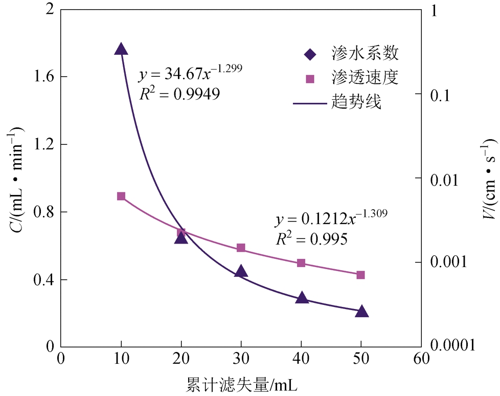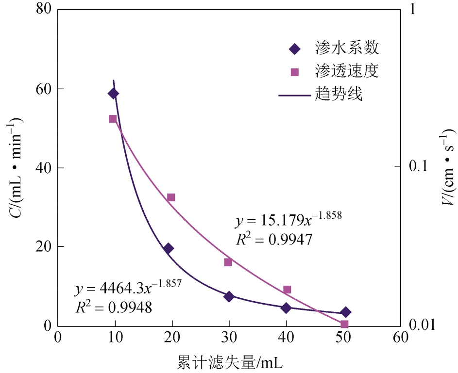 试验项目组数累计滤失量10 mLC/(mL·min-1)V/(cm·s-1)累计滤失量20 mLC/(mL·min-1)V/(cm·s-1)清洁压裂液-原生结构煤114.290.04850.680.002324.880.01660.550.001935.610.01900.600.0020410.530.03580.420.0014平均值 8.820.03000.560.0019冻胶压裂液-原生结构煤12.070.00700.890.003021.320.00450.460.001631.950.00660.540.001841.800.00610.720.0025平均值 1.780.00610.650.0022清洁压裂液-构造煤117.650.059910.340.03512200.000.679450.000.169937.890.02687.270.024749.680.032910.260.0348平均值 58.800.199819.470.0661累计滤失量30 mLC/(mL·min-1)V/(cm·s-1)累计滤失量40 mLC/(mL·min-1)V/(cm·s-1)累计滤失量50 mLC/(mL·min-1)V/(cm·s-1)0.520.00180.300.00100.270.00090.560.00190.310.00110.240.00080.430.00150.380.00130.270.00090.460.00160.350.00120.270.00090.490.00170.340.00110.260.00090.550.00190.270.00090.230.00080.370.00130.290.00100.200.00070.380.00130.300.00100.210.00070.500.00170.290.00100.220.00070.450.00150.290.00100.210.00073.140.01072.330.00791.580.005418.750.063712.000.04087.350.02504.430.01513.150.01071.950.00663.400.01152.260.00771.170.00407.430.02524.930.01683.010.0102 由图3可以看出,压裂液滤失初期渗水系数和渗透速度均较大,而且滤失初期二者的衰减速度也最快,这说明对于煤岩试样其初期滤失程度最高,推测为煤岩干燥性及孔裂隙吸水能力较强导致,后期随着压裂液的不断渗入,煤岩内部孔裂隙水趋于饱和状态,渗水系数及渗透速度的衰减速度和幅度与初期相比逐渐减弱。 3.5 冻胶压裂液渗入原生结构煤滤失参数变化冻胶压裂液通过原生结构煤样其渗水系数与渗透速度与清洁压裂液相比较低,随着累计滤失量的增加二者同样呈幂函数形式降低。其中渗水系数与累计滤失量的数学关系可用y=34.67x-1.299表达,渗透速度与累计滤失量的数学关系为y=0.1212x-1.309,二者相关性良好(R2≈0.995),表明渗水系数和渗透速度与累计滤失量间关系密切,主要是随着冻胶压裂液的不断渗入,煤岩内部孔裂隙的导流通道被冻胶压裂液中的聚合物分子堵塞,导致导流能力衰减,而且随着压裂液的不断渗入煤岩孔裂隙缺陷空间内流体压力逐渐升高,导致冻胶压裂液渗入的驱动压差降低,渗入能力下降。冻胶压裂液渗入原生结构煤滤失参数随累计滤失量变化规律如图4所示。