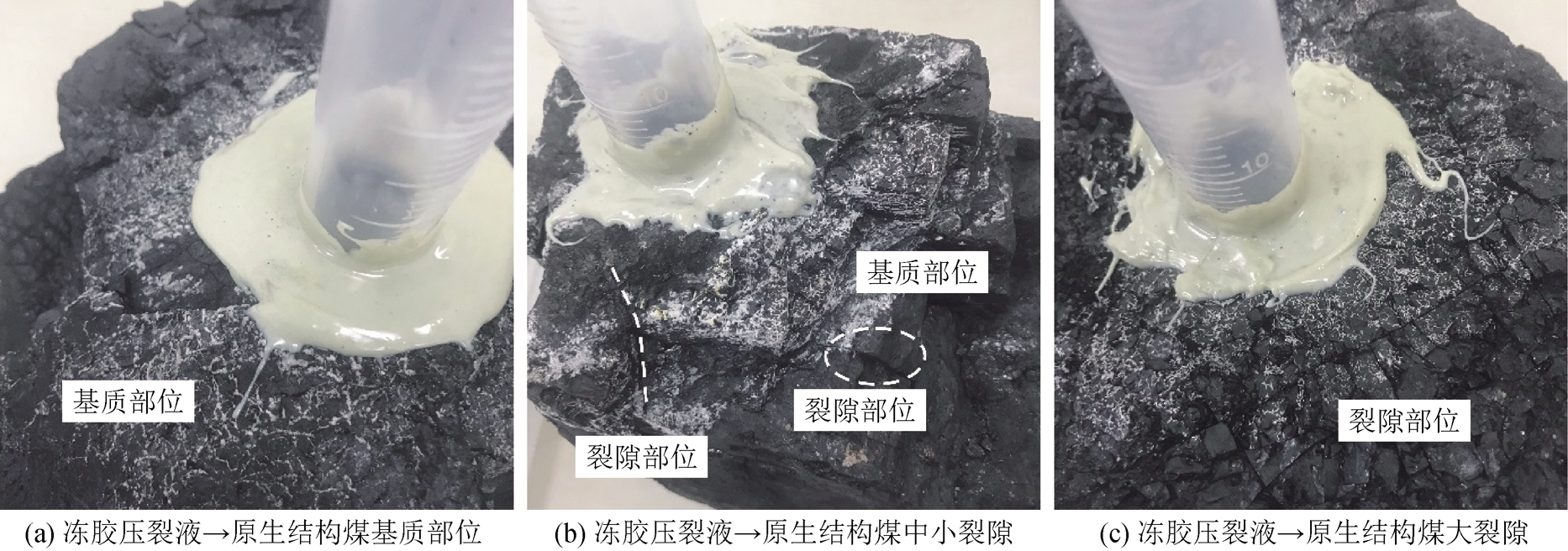 图1 大尺寸煤样渗水试验原理 试验过程中利用量筒内压裂液液柱自重作为工作液滤失动力,在液体自然下渗过程中记录量筒内的液面变化,换算压裂液渗入压力、压裂液渗水系数和渗透速度等参数,同时观测压裂液滤失渗入路径和分布空间等现象。 为避免在渗水过程中出现诸如水-岩作用等对渗入特征参数干扰的可能性,本次试验作如下假设: (1)煤样为弹性材料,裂缝撑宽将导致两侧煤岩基质弹性形变; (2)压裂液渗流过程不考虑水-岩热交换等,热效应暂不考虑; (3)暂不考虑煤岩-压裂液间的水-岩化学反应; (4)渗流过程压裂液的粘度和流变性无变化,液体连续下渗; (5)渗入过程暂不考虑外边界条件。 由于本次试验介质渗入动力为液柱自重,驱动压差较低,因此本次共进行3大类试验,即清洁压裂液渗入原生结构煤试验、冻胶压裂液渗入原生结构煤试验及清洁压裂液渗入构造煤试验,而未设置冻胶压裂液渗入构造煤试验。每类试验共进行4组,期间向4块煤样中分别渗入50 mL体积的压裂液,后期记录量筒内液柱下降特征及煤岩试样的渗水特征现象,包括:压裂液滤失渗入的通道路径、压裂液固相颗粒滤饼分布特征、渗水系数、渗水速度随时间变化规律等。 3 试验结果与分析3.1 清洁压裂液渗入煤岩压裂液滤失试验现象清洁压裂液渗入原生结构煤样主要通过煤岩内生裂隙渗流和煤基岩块致密基质扩散渗透的形式进行,其中内生裂缝部位压裂液快速推进形成指进,该位置压裂液侵入深度较大;相对而言,清洁压裂液渗入构造煤样方式则主要通过沟槽流和窜流形式,压裂液优先沿构造裂缝部位突进,整体上液体滤失速度较快,属于裂缝型滤失。 3.2 冻胶压裂液渗入煤岩压裂液滤失试验现象冻胶压裂液渗入大尺寸煤样压裂液滤失试验特征现象如图2所示。