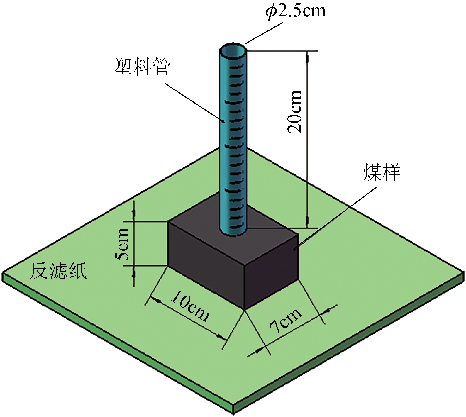 序号性能参数配比1清洁压裂液AOE-7表面活性剂(0.50 mL)、KCl(0.50 g)、水(49.00 mL)2冻胶压裂液胍胶(0.14 g)、KCl(1.00 g)、NaOH(0.10 g)、防腐剂(0.05 mL)、过硫酸铵(0.15 g)、水(48.57 mL) 2 煤岩渗水试验由于煤样内孔裂隙缺陷极度发育,导致材料具有无序性、层次复杂性且空间非均质性极强的结构特征。笔者利用静态常压渗入法对大尺寸(长×宽×高为10 cm×7 cm×5 cm)的长方体原生结构煤、构造煤煤样压裂液静态滤失特征进行试验研究,由于所用煤样大小涵盖煤储层内生裂隙、气胀节理及小型构造节理[14-15]的尺度范围,因此能够获取不同损伤程度的煤岩压裂液滤失非均质性及液体滤失静态参数特征的变化规律。大尺寸煤样渗水试验原理如图1所示。