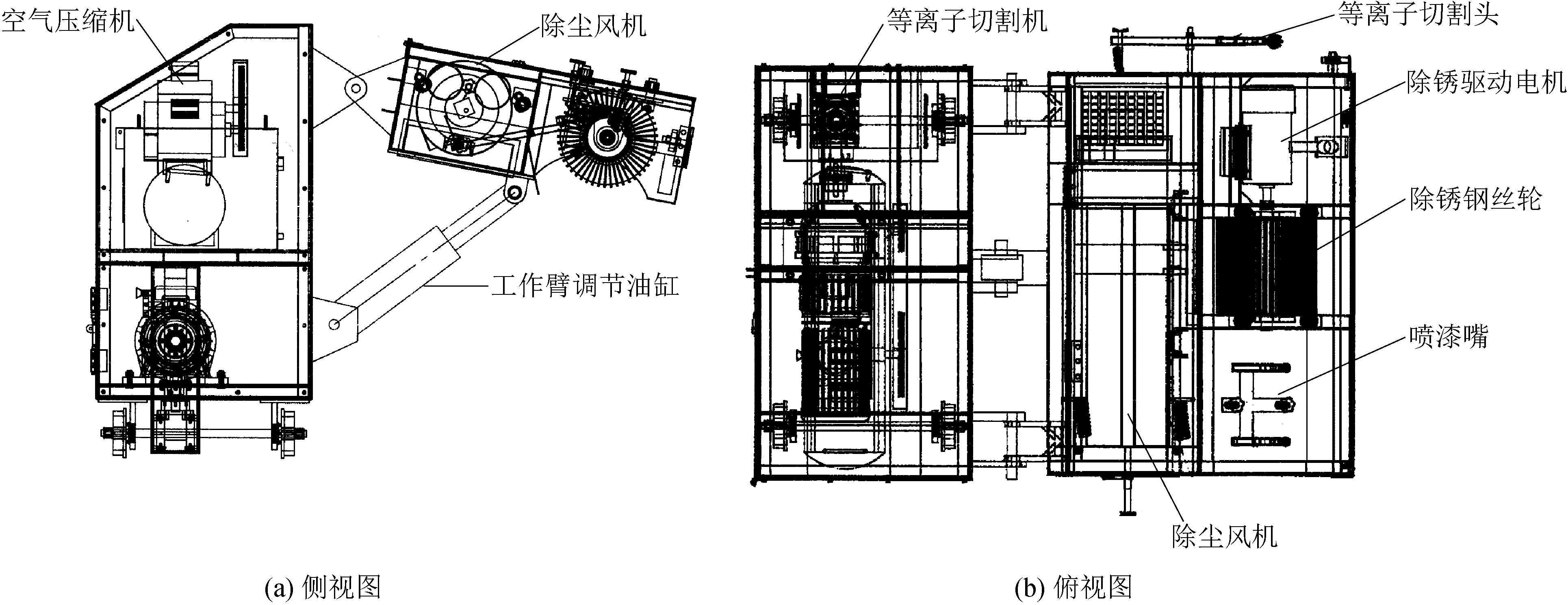 图2 固定支座及管道旋转驱动机构 1.2.3 行走主机 行走主机的功能主要是搭载除锈切割以及喷 漆部件的工作臂行走,主要结构包括行走驱动机构以及工作臂的连接机构。为了满足适应不同直径管道的处理,主机行走采用无级调速技术。根据管道在处理时的布置情况,工作臂铰接与行走在主机的一侧。 1.2.4 工作臂 工作臂主要安装除锈钢丝轮、等离子切割头和油漆喷头,采用箱式结构,将除锈钢丝轮、等离子切割头以及油漆喷头安装于工作臂前部,后部为除尘装置,整个工作臂铰接与行走在主机上。工作臂结构如图3所示。