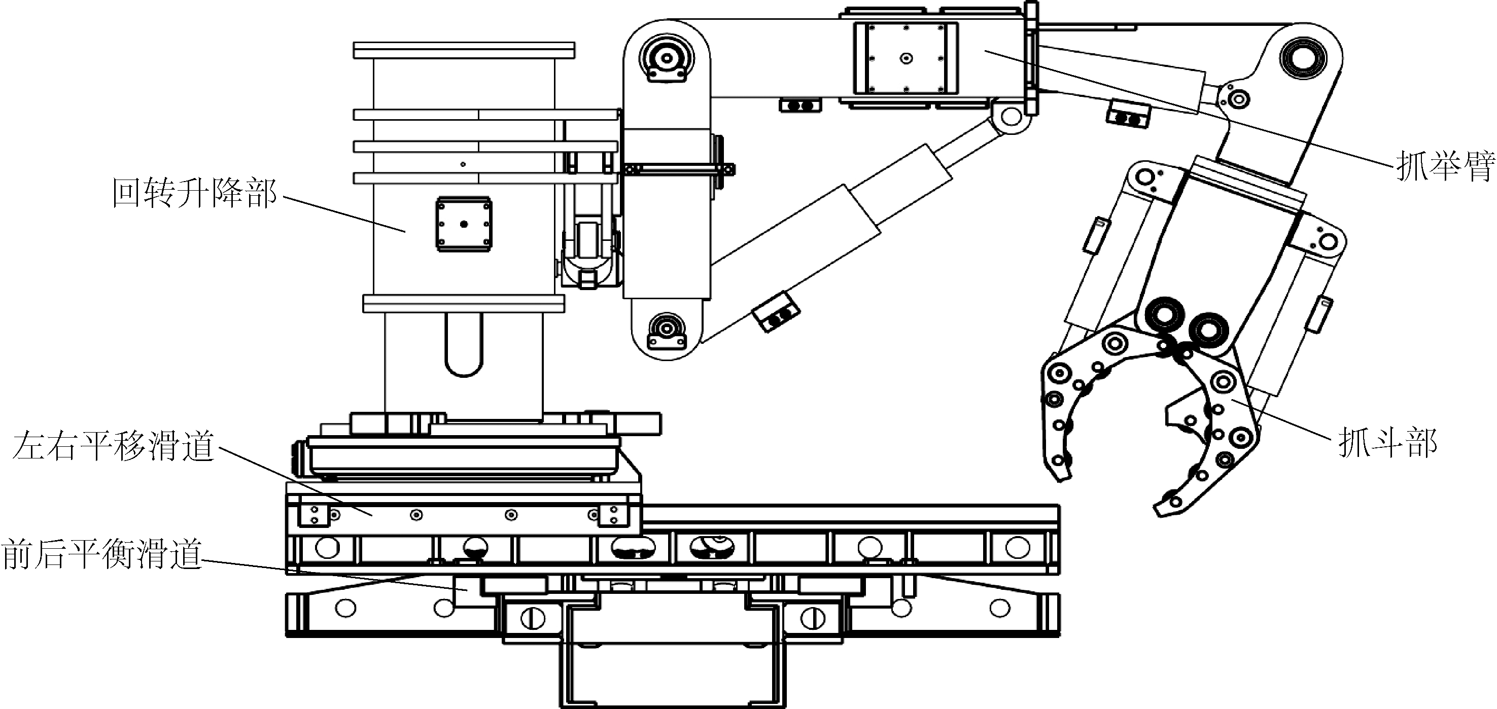 图7 防爆升降平台车结构组成 5.2.1 防爆牵引车 该车以WC-5E防爆工程车为原型,经过对后机架加长、加固等改造,对液压系统、电气系统、传动系统进行重新计算,使之能与升降作业平台所需性能相匹配,具有经久耐用、维修简单、零配件与矿区在用车型通用性强等优点。 5.2.2 作业平台 使用高强度型钢为骨架,采用“四横四纵”结构,在保证作业平台的刚性的同时最大限度地减轻平台的重量。在平台外围采用沉孔方式预留8个100 mm×100 mm的固定孔,作为护栏的安装孔或平台二次开发时的安装孔。在平台的前端还集成了液压操作台、工具材料箱、防触顶传感器、紧急停机按钮以及为日后使用液压钻时的预留液压接口等。 5.2.3 双叉臂 升降平台采用空心剪叉臂结构,保证升降平台工作时良好的稳定性,经过有限元仿真分析最终确定叉臂各连接孔及液压油缸连接孔位置,使其能做到在满足所有参数时质量最轻,作业时叉臂不易变形[10]。 5.3 应用情况及效果2016年5月,安装一队在上湾煤矿1~2煤辅运巷应用防爆型升降平台车,广泛应用井下诸如例管道龙门安装、高空打眼及预埋件安装、高空管道对接、高空电缆吊挂等高空作业。人员进入车厢后,作业人员在作业平台上操作控制手柄将作业平台升至所需高度即可进行作业,随着作业地点向前推移,只需升降车向前移动至下一作业地点即可,不仅省去了传统作业中人工移动脚手架等工序,而且也省去了传统高空作业时人员上下脚手架时带来的安全隐患。在高空安装设备、龙门时则省去了传统作业中对设备、工件的起吊工序,可以将设备、工件及安装附属配件放在作业平台上直接举升至安装位置进行作业。使用脚手架等传统登高工具进行登高作业时需4人协同作业,高空安装管道预埋件为100个/班,人工工效为25个/人·班;使用防爆升降平台车进行登高作业时只需3人,高空安装管道预埋件为180个/班,人工工效为60个/人·班;使用防爆升降平台车的安装工效是使用脚手架等传统登高工具安装工效的240%。防爆型升降平台车提高了高空作业效率、降低了安全风险、减轻了员工的劳动强度、方便了安装作业,具有省人、省力、安全可靠、快捷方便的特点,实现了减人增效。 6 防爆管道抓举车的研发及应用目前,煤矿井下巷道内管道安装管径以DN100-DN500为主,DN150及以下管径通常采用逐点起吊法,先将管道在地面全部连接好,间隔6~10 m吊挂2~3个手拉葫芦,人工手拉葫芦将管道起吊至安装高度,待管道固定好后再逐次拆卸手拉葫芦悬挂到下一个起吊点,循环往复。DN200及以上管径通常采用组段起吊法,将2~4根管道先在地面连接好,间隔6 m吊挂2~4个手拉葫芦,采用人工拉手动葫芦将管道起吊至安装高度,待管道固定并安装好后拆下所有手拉葫芦挂在下一个起吊点,如此往复循环。由于DN200及以上管径大、柔软性差,起吊和对管作业费时费力、效率低、安全隐患大,起吊前准备工作多且延误时间长。防爆管道抓举车可将管道一次抓举到位,彻底解决了传统手拉葫芦起吊的诸多弊端,实现了管道起吊作业由手动向机械自动起吊的转变。 6.1 防爆型管道抓举车主要技术参数防爆管道抓举车主要技术参数如下:外形尺寸(长×宽×高)为7200 mm×1960 mm×2200 mm,最小工作范围(宽×高)为5000 mm×3500 mm,工作状态稳车方式为液压支腿,抓取管道直径为150~500 mm,最大抓举管道重量为1500 kg,最大行走速度为30 km/h,最大举升高度为5000 mm,轴向移动距离为800 mm,横向移动距离为1000 mm,水平旋转角度为14°,抓举机构旋转角度为195°,驱动方式为四驱,停车制动为弹簧制动、液压松闸,工作制动为静压+多盘湿式制动。 6.2 结构组成及工作原理该装置主要由抓举机械手、升降操作台、机架及车厢、动力系统、传动系统、液压系统、电气系统等7部分组成,防爆管道抓举车整体侧视图如图8所示。 6.2.1 抓举机械手 抓举机械手是防爆管道抓举车进行管道铺设作业的重要部件,它位于管道抓举车的后机架上面,抓举机械手由左右平移滑道、前后平移滑道、回转升降部、抓举臂、抓斗部及各个驱动油缸与回转驱动减速器组成。抓举机械手能够实现前后移动距离为 800 mm,横向左右移动距离为 1000 mm,水平旋转 14°,同时抓斗还能绕其回转座轴线旋转 195°,抓举臂中间部分可伸缩 400 mm,从而实现机械手在管道安装铺设过程中的抓、举、伸、让、转、对等功能,防爆管道抓举车抓举机械手结构如图9所示。