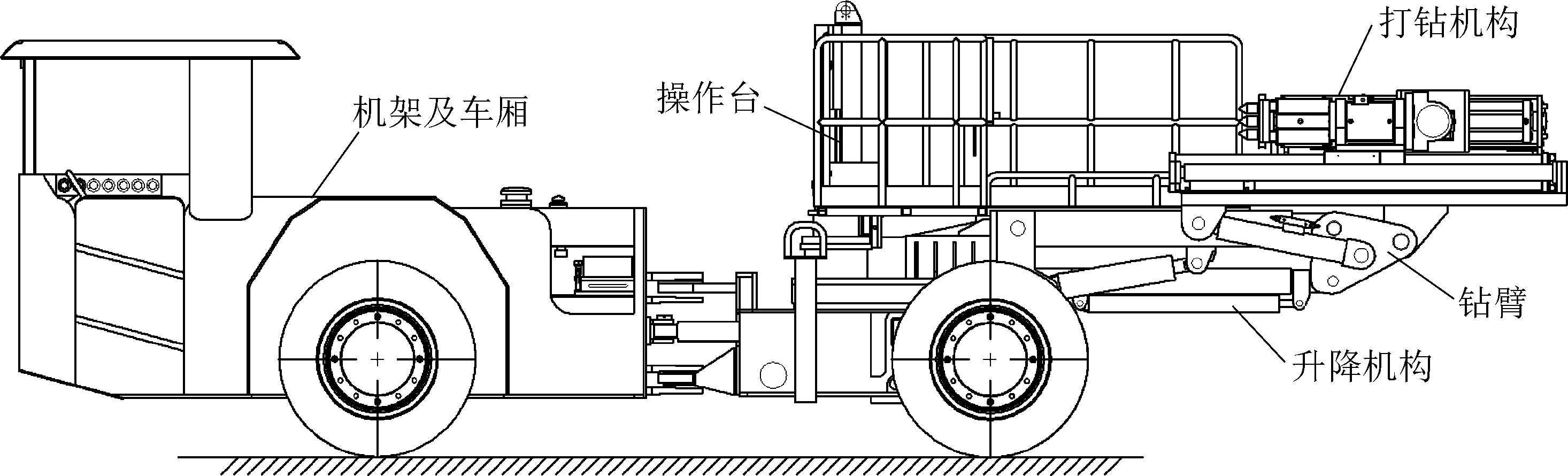 图5 防爆管道吊运车整体侧视图 3.2.1 机架及车厢 防爆吊运车是在原防爆牵引车底盘上加装吊运装置,为了布置吊机,将四轮驱动改为两轮驱动,后机架、车厢、液压系统、电气系统、驱动方式做了重新设计,使其能满足吊机安装后的各项性能参数。吊机安装在后机架上,并配置两只支撑腿,支撑腿安装在后机架上以增加设备的抓地宽度和稳定性[8]。 3.2.2 随车吊机 随车吊机安装在后机架上,随车吊机选用了进口吊机,起重臂系统由内臂和液压伸缩臂两部分组成。在起吊货物时,先将两只支撑腿支撑于地面上,通过操作吊机的控制阀来启动吊机起重臂的液压举升、伸缩及回转系统,从而实现了货物的升降、吊运、回转。在起吊货物时应使用尽可能短的吊臂,保证起吊安全性。同时可在吊臂末端加装自制模具,可以实现管道、电缆的托举,实现吊机的功能扩展。 3.2.3 液压系统 整车采用2套独立的液压系统,一套供机车液压驱动及车辆转向使用,一套供随车吊机使用,在满足吊机的吊装动作外预留一路液压接口回路,供液压钻或液压扳手使用。 3.2.4 电气系统 本车电气系统主要用于机车保护、电源自锁、启动、熄火控制电路、照明和信号提示, 主要由发电机、调节器、控制按钮、钥匙开关、MCDX-III 电源、电磁气阀(启动)、照明开关、照明灯、信号灯、倒车报警装置、矿用柴油机车保护监控仪(系统)等设备组成。 3.3 应用情况及效果2017年5月开始,防爆吊运车在上湾煤矿安装一队进行了应用,吊运DN273管道共计1650根。使用防爆运输车和防爆管道吊运车分别拉运DN273管道,每车拉运12根,防爆运输车采用顶板锚索挂吊链起吊管道的传统装管方式,每班需4人,每班拉运2趟,人均装运工效为6根/人·班;防爆管道吊运车随车吊装管道,每班2人,每班拉运3趟,人均装运工效为18根/人·班,防爆管道吊运车的装运工效是防爆运输车的300%。与传统的装卸方式比较,使用防爆管道吊运车作业效率更高,且机械吊装比人员搬运或手拉葫芦吊装安全风险小、人员劳动强度低。 4 防爆预埋孔钻车研发及应用管线预埋孔的间距一般为1000~5000 mm,孔径小于50 mm一般采用人工手持电钻、风钻或液压钻的钻孔方式,深度为300~1500 mm,预埋件主要为锚杆或螺纹钢;孔径大于50 mm一般采用人工手持水钻的钻孔方式,深度为500~1000 mm,预埋件主要为槽钢。掘进工作面支护所用的两臂锚杆机虽然钻孔效率高,因设备笨重履带行走移动速度慢,且需频繁接电,无法应用到管线预埋孔的施工。此外,管线预埋孔施工所采用的手持钻机的钻孔方式辅助作业量大、劳动强度大、粉尘和噪音大、安全风险大且作业效率低,尤其是大孔径预埋孔施工采用手持水钻钻孔钻进难度大,需2人同时协同推进,钻孔效率更低。防爆预埋孔钻车改变了原有的手持式钻孔方式,实现了管线预埋孔的机械钻孔,即可打顶眼,也可打帮孔和底孔,即可钻小孔,也可钻大孔,且自行移动快速、灵活。 4.1 主要技术参数防爆预埋孔钻车主要技术参数如下:外形尺寸(长×宽×高)为8100 mm×1960 mm×2200 mm,最小离地间隙为215 mm,打孔直径为18~180 mm,侧帮打孔高度为200~4800 mm,工作范围(宽×高)为5500 mm×4000 mm,驱动方式为四驱,停车制动为弹簧制动、液压松闸,工作制动为静压+多盘湿式制动,推进方式为油缸,推进行程为1700 mm,推进速度为10000 mm/min(可调),空载返回速度为20000 mm/min(可调),额定转速为500/1000 mm/min,额定压力为18 MPa,回转支承旋转角度为±30°,工作平台高度范围为1200~2000 mm,打钻机构左右旋转角度为180°,打钻机构前后旋转角度为180°,打钻机构滑动行程为2300 mm。 4.2 结构组成与工作原理防爆预埋孔钻车由钻臂、升降机构、打钻机构、操作平台、动力系统、机架及车厢、传动系统、液压系统、电气系统等9部分构成,其整体侧视图如图6所示。