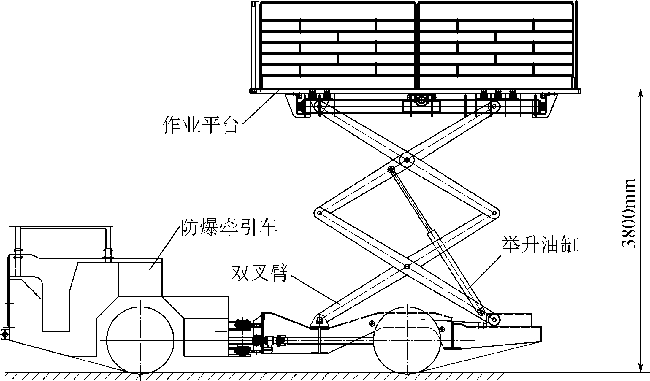 图6 防爆预埋孔钻车整体侧视图 4.2.1 钻臂 钻臂机构一端通过回转支撑与后机架连接,另一端通过三角架与升降机构连接。主要由钻臂、钻臂支承杆、各种油缸等部分组成。其主要动作功能有:臂身上下升降 45°;臂身±15°角向外回转;钻臂方筒整体前后伸缩 500 mm;钻臂回转座整体前后伸缩 500 mm。 4.2.2 升降机构 升降机构可以翻转,通过与钻臂连接的三角架,实现水平前后移动和竖直上下移动,升降行程为2300 mm,保证在钻孔时水平和竖直方向的孔都能在一条直线上,提高钻孔作业的标准化程度。 4.2.3 打钻机构 打钻机构通过 2 个旋转油缸与升降机构连接,可以上下前后、左右各 180°的旋转,结构紧凑、灵活。打钻机构还有瞄准装置,防止在钻孔作业时钻头跑偏[9]。 4.2.4 操作平台 钻车设有可升降的操作平台,适应在不同高度的钻孔作业,操作平台由料斗、 操作台、升降机构构成。 4.2.5 动力系统 动力系统由柴油机、废气处理箱、废气波纹管、进气波纹管、进气箱、水油散热器、空气滤清器等组成。 4.2.6 机架及车厢 车架主要是由前机架和后机架两大部件铰接组成。前、后机架可作左右各37°的相对摆转,车辆随转向油缸的伸缩实现转向。前机架是各主要元部件的安装基础,并设置敞开式驾驶室。前驱动桥通过钢板弹簧悬挂在前机架上,以实现减振。后机架主要承载升降平台、钻臂打钻机构等,后驱动桥通过钢板悬挂在后机架上。 4.2.7 传动系统 本车传动方式采用液力机械传动,前、后桥四轮驱动。传动系统由柴油机、变矩器、变速箱、前后传动轴和驱动桥等组成。 4.2.8 液压系统 预埋孔钻车各动作机构为全液压动力驱动,液压系统由转向、制动及打钻液压系统3部分组成。 4.2.9 电气系统 本车电气系统主要用于机车保护、电源自锁、启动、熄火控制电路、照明和信号提示。 主要由发电机、调节器、控制按钮、钥匙开关、MCDX-III 电源、电磁气阀(启动)、照明开关、照明灯、信号灯、倒车报警装置、矿用柴油机车保护监控仪(系统)、工作观察影像等设备组成。 4.3 应用情况及效果2018年1月,安装一队在上湾煤矿1~2煤四盘区支架专用巷应用防爆预埋孔钻车。共施工Φ42 mm钻孔10400个,平均每班施工140个;施工Φ160 mm、深600 mm的预埋孔2160个,平均每班施工30个。采用防爆预埋孔钻车需2名作业人员,每班施工Φ42 mm钻孔140个,人均工效为70个/人·班;每班施工Φ160 mm钻孔30个,人均工效为15个/人·班。采用手持式液压钻打眼需3名作业人员,每班施工Φ42 mm钻孔90个,人均工效为30个/人·班;采用手持式水钻钻孔需3名作业人员,每班施工Φ160钻孔12个,人均工效4个/人·班。施工Φ42mm钻孔采用防爆预埋孔钻车的人工工效是采用手持钻人工工效的233%,施工Φ160 mm钻孔采用防爆预埋孔钻车的人工工效是采用水钻钻孔人工工效的375%,因此,采用防爆型预埋孔钻车的人工综合工效是采用手持式钻具钻孔人工综合工效的304%。此外,防爆预埋孔钻车钻孔的深度和对煤壁的垂直度是通过位置传感器来控制,所以钻孔质量优于人工手持打孔。采用防爆预埋孔钻车钻孔不仅减轻了员工的劳动强度、降低了作业工程中的安全风险、减轻了粉尘和噪音的职业危害,而且提高了钻孔效率和钻孔质量。 5 防爆升降平台车研发及应用神东矿区各矿井主要大巷及工作面巷道高度都在3000 mm以上,为了保证辅运巷内车辆行驶以及运输巷运输机安装等,管道、电缆需要尽量靠近顶板及煤壁安装,以保证巷道有效截面积。在管线安装过程中,经常涉及高处打眼、安装预埋、连接管道、敷设电缆等高空作业。在传统高空施工作业中往往使用搭脚手架、铁质平台等,由于脚手架和铁质平台不便移动且不能适应安装高度变化的需求,制约了在高空作业过程中的作业效率,且脚手架和铁质平台结构简单,容易晃动,又无防护栏,易发生人员高空坠落事故,存在很大安全隐患。防爆升降平台车可随安装作业进度同步跟进,高度连续可调以适应安装高度变化的需求,平台车车厢整体稳固并设置防护栏,彻底解决了脚手架、铁质平台等传统登高工具的使用弊端。 5.1 主要技术参数防爆升降平台车主要技术参数如下:最大举升重量为2000 kg,最大调平(前)为10°,最大举升高度为3800 mm,作业平台长度为4000 mm,作业平台宽度为1960 mm,作业平台护栏高度为1200 mm,外形尺寸(长×宽×高)为7930 mm×1960 mm×2580 mm,最大运行速度为30 km/h,最小离地间隙为215 mm。 5.2 结构组成与工作原理防爆升降平台车主要由防爆牵引车、作业平台、双叉臂等3部分组成,其结构组成如图7所示。