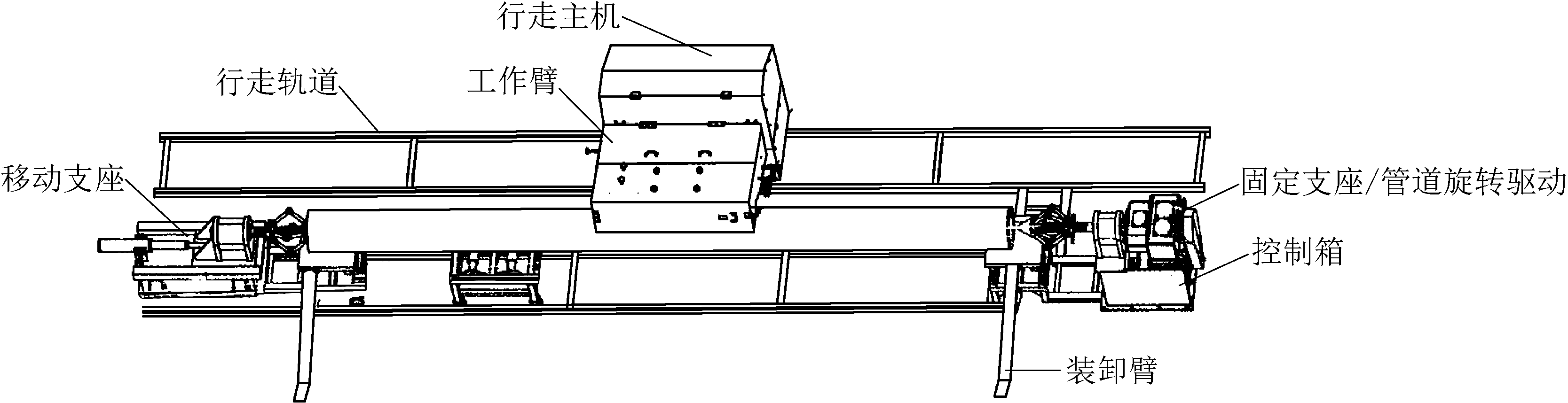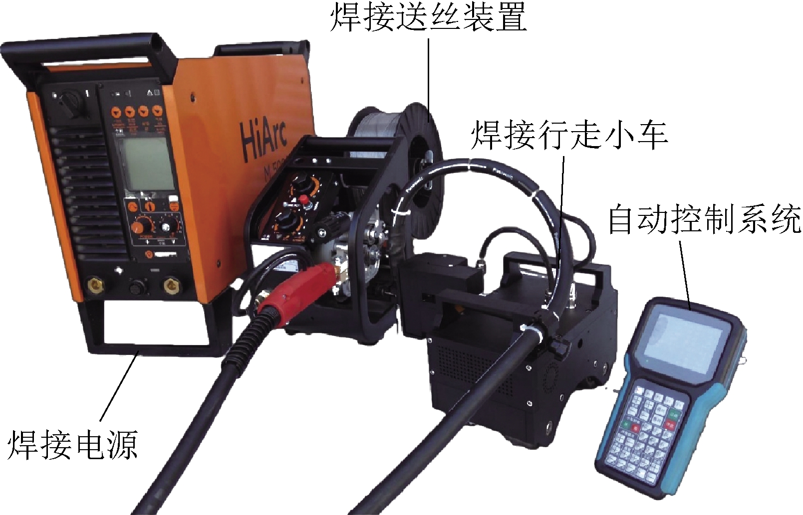 图3 工作臂结构 1.2.5 上下料机构 上下料装置由铰接臂和控制油缸组成,工作时将管道放置在铰接臂的前端,伸出控制油缸,当管道升到与升降平台同高度时,将管道滚到升降平台,再由升降平台将管道升高到与管道驱动旋转卡具同等的高度。 1.2.6 控制箱 整套设备的电气、液压泵站以及液压控制部分全部集中在控制箱内,控制箱为箱式结构,共分为3个空间,前部下半部分为电气控制空间,前部上半部分为操作手柄、按钮以及开关等,后半部分为液压泵站与液压控制阀空间。 1.3 应用情况及效果2016年6月,道切割除锈刷漆一体机在上湾煤矿安装后进行了应用,DN100管道除锈刷漆共计4500根。在该设备未使用前,平均每班4名人员给DN100管道手工除锈刷漆,可以完成60根,人工工效为15根/人·班。使用该设备后,每班需2名作业人员,每班平均处理96根管道,人工工效为48根/人·班,该设备的人工工效是手工除锈刷漆的320%,且具有省人、省力、安全可靠、作业效率高等优点,可避免有害粉尘和有害气体对员工健康的职业危害和环境污染。 2 管道自动焊接机的研发及应用煤矿机电安装中需要大量焊接各种管径的铁质管道,管道焊接有管道-法兰焊接与管道-管道焊接,无论是管道-法兰焊接还是管道-管道焊接都因为焊材是圆周而非是平面,在焊接中包含了平焊、立焊、仰焊等多种焊接技术,目前主要以人工焊接为主[3]。尤其是需要管道现场焊接对接,由人工完成焊接时效率更低,因此管道-法兰焊接和管道-管道焊接影响着管道工程的安装速度。因此研发管道自动焊接机,既可以完成管道-法兰焊接又可以完成管道-管道焊接的专用设备,以取代人工焊接。 2.1 主要技术参数管道自动焊接机主要技术参数如下:焊接管道直径为150~800 mm,管壁厚度为6~20 mm,供电电压为380/660 V,送丝方式为自动,焊接方式为自动/手动,控制方式为无线遥控,无线遥控最小有效距离为50 m。 2.2 结构组成与工作原理管道自动焊接机主要由焊接行走小车、焊接电源、焊接送丝装置、自动控制系统4部分组成,如图4所示。