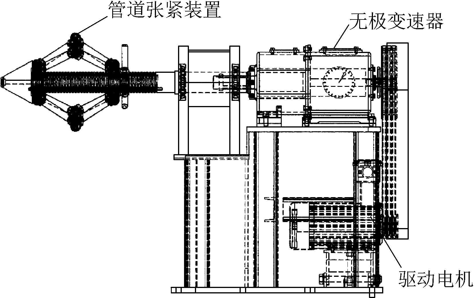 图1 管道切割除锈喷漆一体机总体结构 1.2.1 固定支座及管道旋转驱动机构 固定支座的功能一是在处理管道时支撑管道的一端,起到固定张紧管道的作用,二是安装驱动管道旋转的传动机构,使管道在处理过程中处于旋转状态[2]。管道旋转驱动电机布置在支座箱体内。固定支座及管道旋转驱动机构如图2所示。 1.2.2 移动支座 移动支座的功能是支撑管道并且可根据管道长度在轨道上来回移动,在处理管道时要起到张紧管道的作用,主要包括的机构有管道卡具、管道升降平台、支座移动驱动机构等。