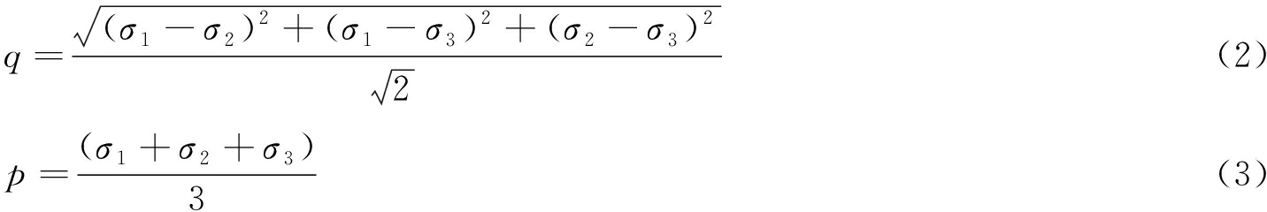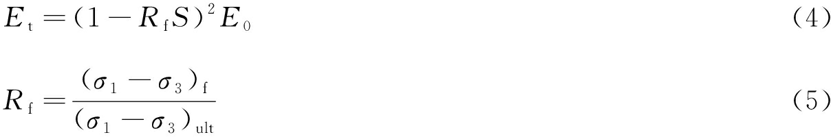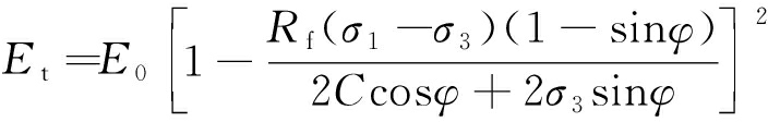 式中:E0——初始切线弹性模量,MPa; Pa——大气压,取0.1 MPa; K、n——无量纲参数; (σ1-σ3)ult——双曲线的渐近值,即极限强度,MPa。 2.2 切线弹性模量切线弹性模量表达式为: (3) 或表示为: