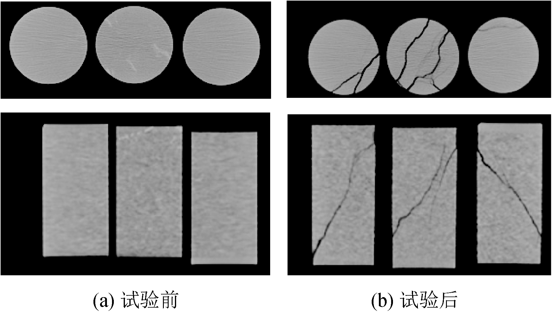 图2 岩石轴向应力与轴向、横向、体应变曲线 随围压的增高,岩石三轴抗压强度和残余强度增大,峰值应力点对应的轴向应变、横向应变增大,体应变趋于0;随围压的增高,弹性阶段(AB)的长度增加,岩石呈脆性- 塑性- 延性转变。CT机扫描岩石三轴压缩试验试件破坏形式如图3所示,破坏形式为剪切破坏,且破裂面与水平方向的夹角随围压的增高而减小。