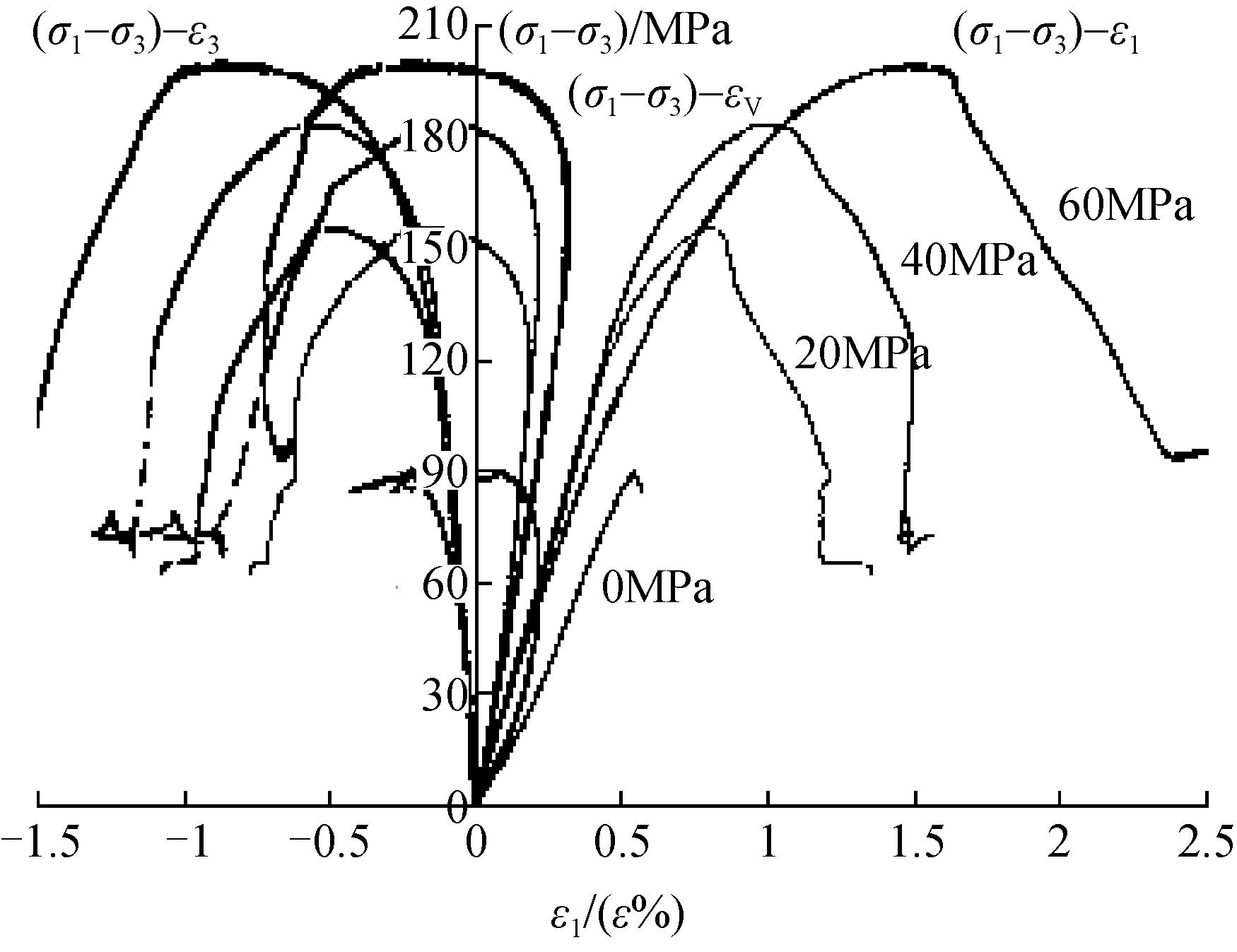 (3)用 (4)因工程中常见的变形是平面应变,常规三轴的应变条件是轴对称,因此对内摩擦角进行了修正: (4) 式中:Φc——轴对称应力条件下的内摩擦角; Φp——平面应变条件下的内摩擦角。以上这4种改进方法都考虑了中间应力σ2对土体强度和变形的影响,改进方法(1)和(2)属于正弹模、泊松比一类,改进方法(3)修正了弹性模量、泊松比和摩尔-库仑准则,改进方法(4)修正了摩尔-库仑准则。 因岩石的变形与土的变形存在较大差异,以上改进的邓肯-张模型只能描述土体的变形,不能描述岩石应变软化阶段、残余强度、剪胀性。因此基于该模型的优缺点,在试验研究的基础上对该模型进行了改进,使之能描述岩石材料的变形特性。 1 高围压下砂岩力学特性的试验研究1.1 试验设备试验设备为美国MTS公司生产的MTS815岩石力学试验系统,该岩石力学试验机主要测试岩石等材料在高温、高围压条件下的力学性质及渗流特性,轴向最大载荷2800 kN,围压最大80 MPa,孔隙压力最大80 MPa,温度最高200℃。可以采用力、位移、轴向应变、横向应变等控制方式,测试精度高、性能稳定,能测试岩石的应力- 应变全过程曲线。 试验岩样取至四川川煤石洞沟煤矿,岩性为砂岩,将岩块加工成为圆柱体试件,试件直径50 mm,高度100 mm,试件上下端面的平整度小于0.02 mm。试验测试采用位移控制方式,加载速度为0.1 mm/min,围压分别为0 MPa、20 MPa、40 MPa、60 MPa,试件加工和测试符合国际岩石力学学会(ISRM)的标准。试验前后用CT机对试件进行横断面、纵断面扫描,分析三轴压缩试验岩石的断裂特征。 1.2 高围压下砂岩力学特性砂岩在不同围压下的应力- 应变全过程曲线如图1所示。由图1中可以看出:岩石的应力应变全过程分为4个阶段[9-12]:初始压密(OA)、弹性变形(AB)、应变硬化(BC)和应变软化(CD),岩石轴向应力与轴向、横向、体应变曲线如图2所示。初始压密阶段和弹性变形阶段轴向应变大于横向应变,体应变增加,试件体积减小,岩石被压密实,部分原生裂隙闭合,围压增高岩石弹性段(AB)增长;应变硬化阶段应力与轴向应变为非线性关系,这个阶段体应变有一个最大值,即屈服点S,这个点对应的应力为屈服应力(σS),屈服点之前试件的体应变都在增大,试件体积减小,屈服点之后,试件的横向变形迅速增加,体应变开始减小,试件体积开始增大,到峰值时,体应变趋于零,试件又恢复原体积。这个阶段岩石内部开始产生微裂隙,且裂隙随加载载荷增加加速扩展,最终裂隙汇合贯通使岩石破裂;应变软化阶段(CD)试件体积膨胀,体应变为负值,说明试件体积大于原体积,试件破裂后,岩石的承载能力没有完全丧失,还具有一定的承载能力,强度减弱到残余强度。