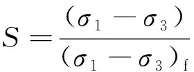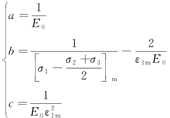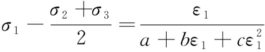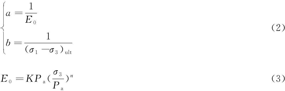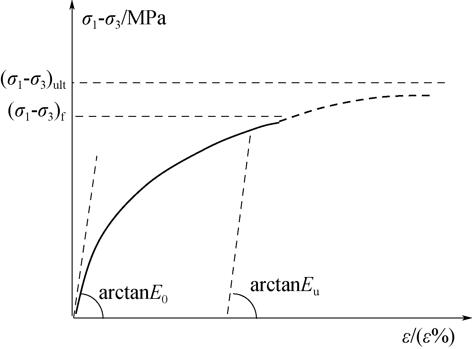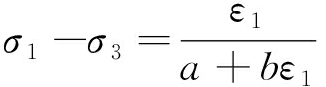 图4 邓肯- 张模型应力差与轴向应变曲线 (1) 式中:σ1-σ3——主应力差,MPa; ε1——轴向应变; a、b——模型参数。 a和b的取值为: