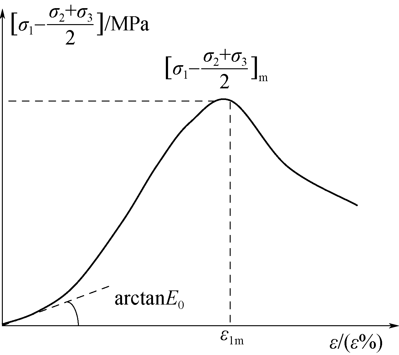 图3 砂岩的剪切破坏 2 邓肯-张本构方程2.1 邓肯-张本构方程应力应变关系邓肯- 张本构方程是邓肯和张金荣等人根据土力学试验提出的非线性增量弹性模型,主应力差(σ1-σ3)与轴向应变ε1关系为双曲线[13-14],该模型参数确定简单、使用方便,如图4所示,其表达式为: